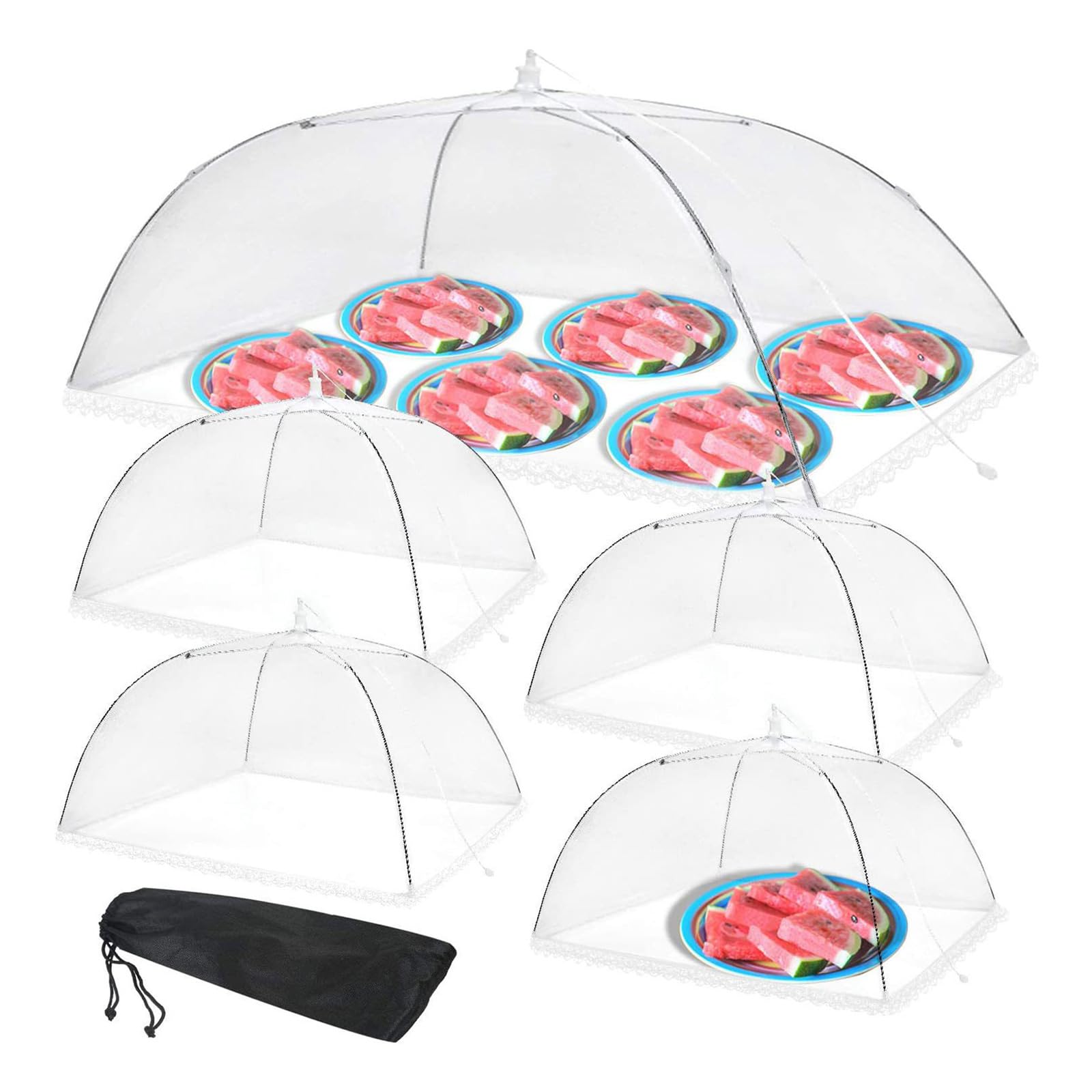 Genieße dein Essen ohne lästige Insekten! Dieses 6-teilige Set mit Pop-Up-Lebensmittelabdeckungen schützt deine Speisen zuverlässig. Enthalten ist 1 große Abdeckung (100x60cm) und 5 kleinere (44x44cm) für verschiedene Bedürfnisse. Aus feinmaschigem Polyester-Gewebe mit verzinktem Stahlrahmen für Stabilität. Einfach wie ein Regenschirm aufklappen und nach Gebrauch flach zusammenfalten. Perfekt für Grillpartys, Picknicks, Buffets oder Campingausflüge. Schützt vor Fliegen, Mücken und anderen Insekten. Leicht zu reinigen - einfach unter klarem Wasser abspülen. Auch als Pflanzenschutz oder zur Belüftung von Lebensmitteln geeignet. Mach deine Outdoor-Events entspannt und insektenfrei!