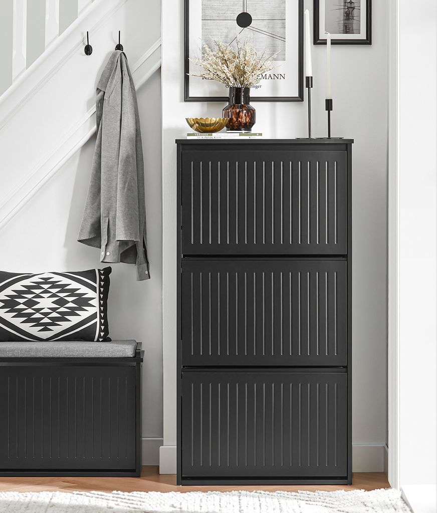 Endlich Ordnung im Flur! Diese zwei schmalen Schuhschränke (60x23x118 cm) sind perfekt für enge Diehlen und Flure. Jeder Schrank hat 3 Klappen und 6 Ablagen - Platz für 12-16 Paar Schuhe! Die höhenverstellbaren Einlegeböden passen sich allen Schuhgrößen an - von Sneakern bis Halbschuhen. Die Kippmechanik ist super praktisch: Einfach aufklappen, Schuhe rausnehmen, zuklappen - selbst in beengten Verhältnissen. Das schwarze Design ist zeitlos und passt in jede Einrichtung. Ob im Eingangsbereich, unter der Treppe oder im Gästezimmer - überall wo Schuhe Chaos verursachen. Schluss mit herumstehenden Schuhen und Stolperfallen! Die robuste Verarbeitung garantiert lange Freude. Einfach aufbauen und sofort nutzen. Dein Flur wird aufgeräumt und du findest deine Lieblingsschuhe sofort wieder!