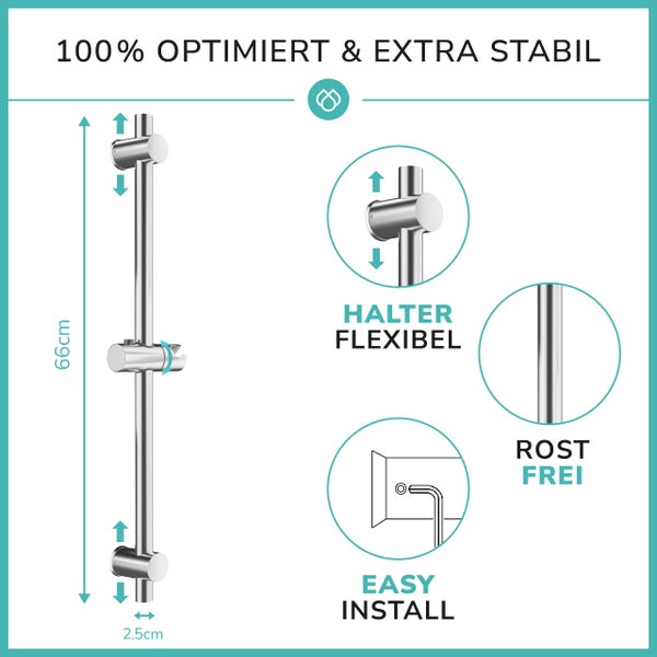 Perfekt für dein Badezimmer! Diese 66cm lange Duschstange aus rostfreiem Edelstahl ist ein echter Game-Changer. Der Duschkopfhalter ist 360° drehbar und in der Höhe verstellbar - so findest du für jede Körpergröße die optimale Position. Die verstellbare Wandhalterung ist super praktisch: Sie passt sich vorhandenen Bohrlöchern an oder kann auch über Fugen montiert werden, ohne dass du neue Löcher bohren musst. Die rutschfeste Gummimanschette hält deinen Duschkopf sicher fest, egal bei welchem Winkel. Aus bleifreiem Edelstahl gefertigt, ist sie korrosionsbeständig und hält ewig. Perfekt für kleine Badezimmer, da sie platzsparend an der Wand oder in der Ecke montiert werden kann. Einfach montieren und endlich bequem duschen!