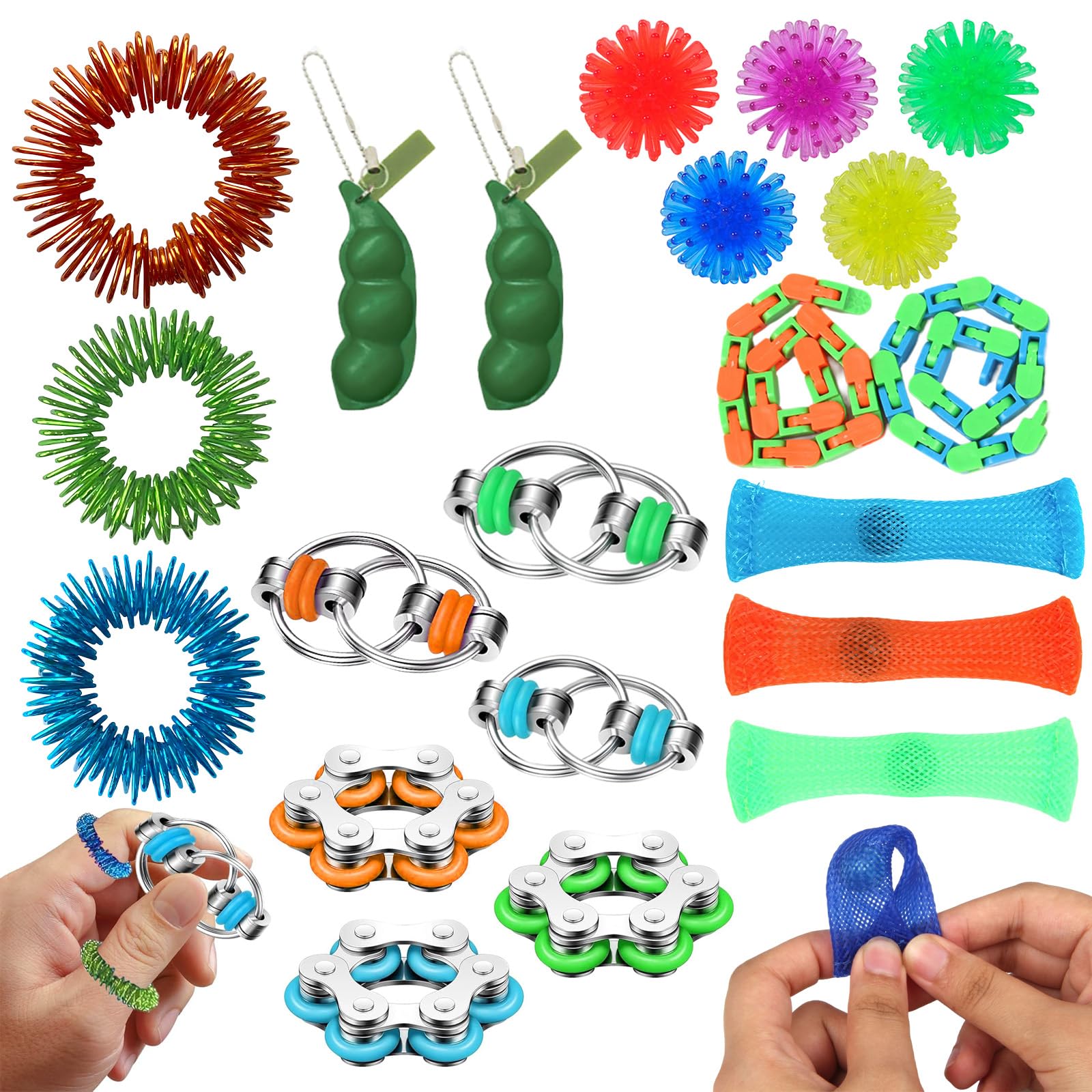Kennst du das? Die Hände wollen einfach nicht stillhalten? Diese 6 Sensorik Armbänder sind die perfekte Lösung! Jedes Armband hat eine andere Struktur und bietet dir verschiedene taktile Reize. Super für Kinder mit ADHS, Autismus oder einfach nur unruhigen Händen. Aber nicht nur für Kids - auch Erwachsene profitieren davon! Einfach ans Handgelenk und bei Stress oder Unruhe daran reiben oder rollen. Das beruhigt und hilft, sich besser zu konzentrieren. Aus weichem Silikon mit flexiblem Stahlband innen - angenehm zu tragen und sicher. In knalligen Farben: Rot, Blau, Gelb, Violett, Grün - da ist für jeden Geschmack was dabei. Perfekt für die Schule, Meetings, unterwegs oder einfach zu Hause. Und das Beste: Sie sind superleicht zu reinigen - einfach mit Wasser abwischen. Diskret, wirksam und immer griffbereit. Ob als Geschenk, für den Schreibtisch oder die Reise - diese Armbänder machen nicht nur Spaß, sondern helfen wirklich beim Entspannen und Fokussieren. Probier's aus!