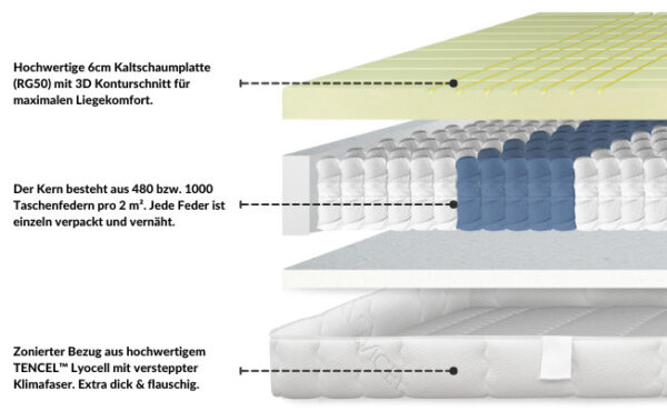 Erholsamer Schlaf war noch nie so komfortabel! Diese ROYGBIV Taschenfederkernmatratze in 25 cm Höhe und Härtegrad H3 bietet dir 7-Zonen-Unterstützung für perfekte Körperanpassung. Das innovative Taschenfederkern-System ist geräuschlos - du störst deinen Partner nicht bei nächtlichen Bewegungen. Besonderes Highlight: Der Diatomenschaum (Kieselalgenbaumwolle) reguliert Feuchtigkeit und ist atmungsaktiv. Verstärkte Kanten verhindern ein Einsinken und vergrößern die nutzbare Liegefläche. Drei verschiedene Federstärken (1,8mm, 2,0mm, 2,1mm) bieten präzise Unterstützung für verschiedene Körperbereiche. Der hautfreundliche Bezug ist weich und pflegeleicht. Geliefert wird die Matratze vakuumverpackt - nach dem Auspacken 48-72 Stunden ruhen lassen, bis sie sich voll entfaltet hat. Perfekt für Paare, Leichtschläfer und alle, die Wert auf ergonomischen Schlafkomfort legen. Mit 4 Tragegriffen für einfaches Handling.