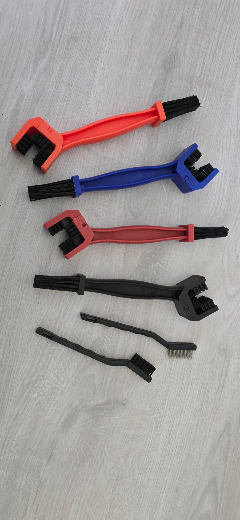 Na, deine Fahrrad- oder Motorradkette sieht auch schon etwas mitgenommen aus? Mit diesem 7-teiligen Reinigungsset kriegst du sie wieder blitzblank! Enthalten sind verschiedene Bürsten für jeden Zweck: zwei Kettenbürsten für die Hauptreinigung, eine schmale Bürste für enge Stellen, ein Getriebereinigungsschaber und drei Detailbürsten aus Kunststoff, Draht und Kupfer. Die ergonomischen Griffe liegen super in der Hand und die hochwertigen Nylonborsten haaren nicht. Perfekt für Mountainbikes, Rennräder, Citybikes und Motorräder. So entfernst du Schmutz, Ölreste und Rost ganz einfach - ohne die Kette abmontieren zu müssen. Deine Kette wird es dir mit längerer Lebensdauer und besserer Performance danken! Ein Muss für jeden Rad- und Motorradfahrer.