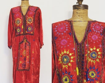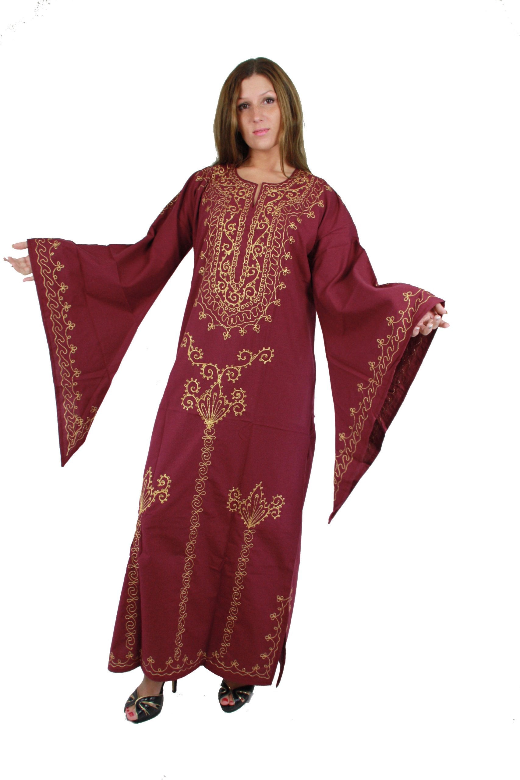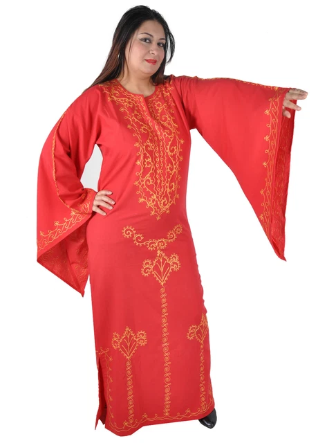 Wow, dieser Egypt Bazar Kaftan ist ein echter Hingucker! Im 70er Jahre Style mit wunderschöner orientalischer Stickerei in schwarz und rot. Die Trompetenärmel geben dir diesen lässigen, bohemian Look. Mit ca. 145cm Länge knöchellang - super elegant! Die Gehschlitze sorgen für totale Bewegungsfreiheit. Perfekt als Hauskleid, für den Sommerurlaub, Partys oder einfach wenn du dich mal wie eine Prinzessin fühlen willst. Weit und luftig - mega bequem! Die glitzernde Stickerei macht jedes Outfit besonders. Ein Kleid das auffällt und dabei so bequem ist wie ein Schlafanzug. Einfach überziehen und strahlen - mehr braucht's nicht für den perfekten Tag!