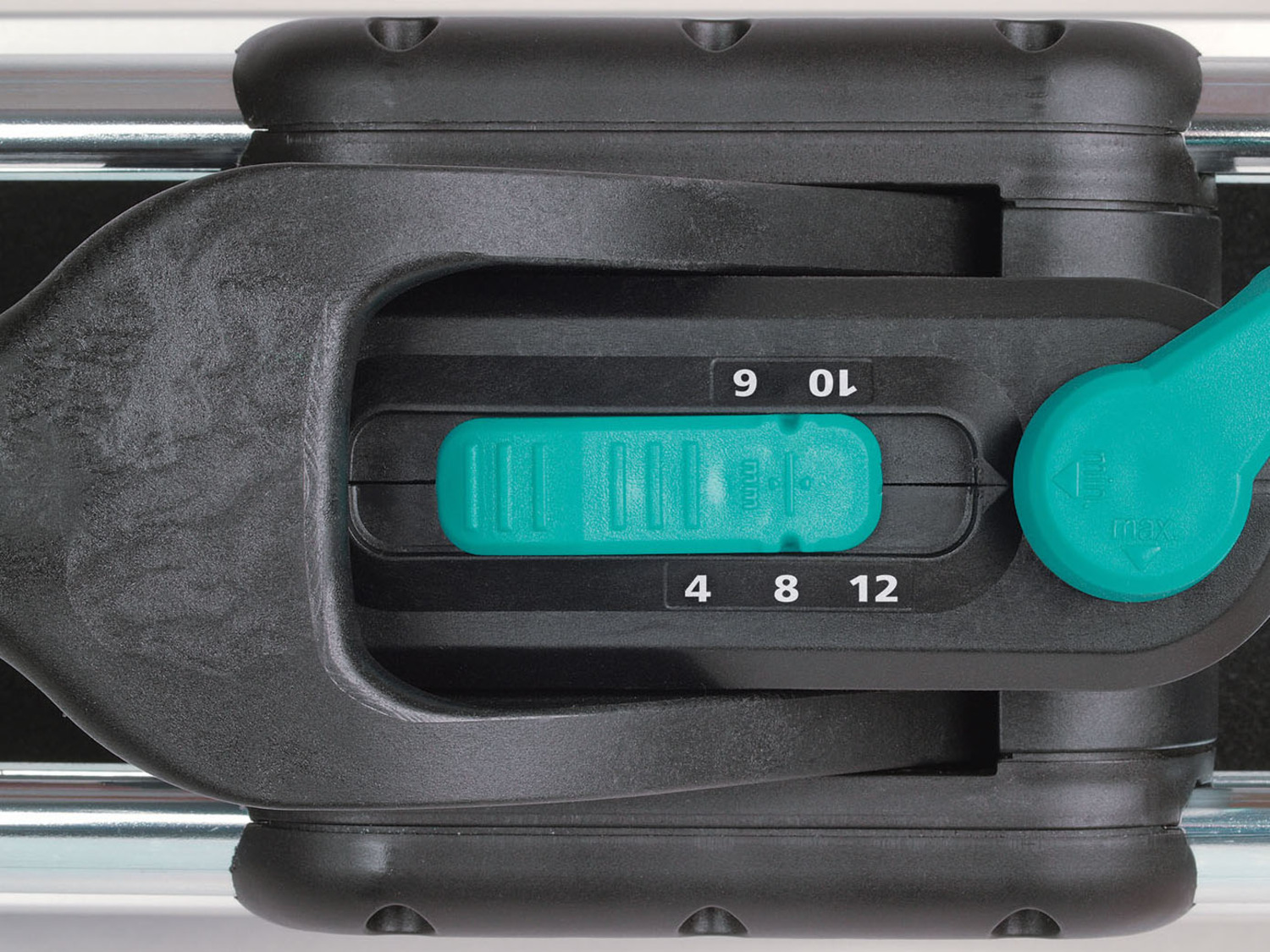 Mit C-Profilführung und 6 Kugellagern läuft das 20mm Schneidrad butterweich. Nach dem Ritzen einfach den Metallkeil ausfahren und die Fliese sauber brechen.