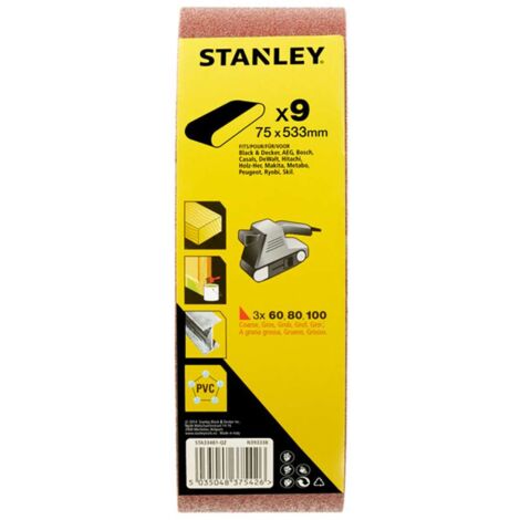 Stanley Qualität für deine Schleifarbeiten! Dieses Set mit 3 Schleifbändern (75x533mm) in den Körnungen K60 (extra grob), K80 (grob) und K100 (mittel) ist perfekt für alle Bandschleifer. Passt für Black+Decker BD75, BD75E, KA75, KA75E, KA88 und viele mehr - auch AEG, Bosch, DeWalt, Makita! Egal ob Holz, Metall, Mauerwerk, Lack oder Kunststoff - für jedes Material die richtige Körnung. Die Markenqualität von Stanley garantiert gleichmäßige Ergebnisse und lange Lebensdauer. Einfach auf den Schleifer spannen und los geht's! Damit werden deine Schleifprojekte zum Kinderspiel. Profi-Ergebnisse für Heimwerker - typisch Stanley!