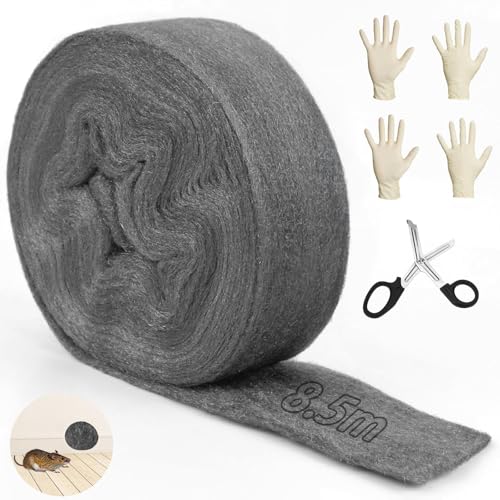 Schluss mit ungebetenen Nagetieren! Dieses 8,5 Meter lange Stahlwolle-Set in Feinstufe 0000 ist die perfekte Lösung gegen Mäuse im Haus. Einfach in Löcher, Ritzen und Rohre stopfen - die scharfen Metallfasern halten Mäuse zuverlässig fern. Im Set enthalten: Stahlwolle, 2 Paar Handschuhe und eine Schere zum Zuschneiden. Extrem flexibel, passt sich jeder Öffnung an. Auch ideal zum Polieren von Metall oder Reinigen von Oberflächen. Einfach Handschuhe anziehen, Stahlwolle zurechtschneiden und in die Löcher drücken. Effektiver und günstiger als teure Schädlingsbekämpfung!