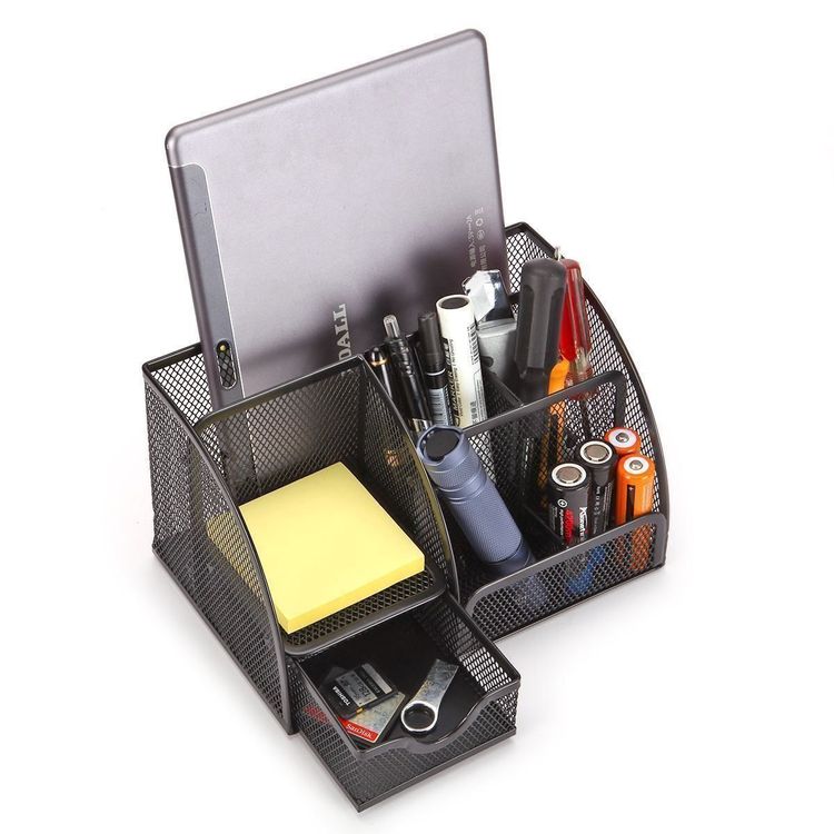 Endlich Ordnung auf dem Schreibtisch! Dieser NoChoX Organizer aus Metall ist genau das Richtige. Mit 8 Fächern und 1 ausziehbarer Schublade - Platz für Stifte, Hefter, Schere, Post-its, Klebeband und alles andere. Maße: 20x11x10.5cm - kompakt aber geräumig. Aus robustem Mesh-Metal, durchsichtig damit du alles schnell findest. Glatte Kanten ohne scharfe Ecken. 4 rutschfeste Gummifüße schützen deinen Tisch. Schwarz passt zu jedem Büro-Stil. Für Zuhause, Büro, Schule oder Werkstatt. Macht deinen Arbeitsplatz gleich viel aufgeräumter und angenehmer. Du findest alles sofort und sparst Zeit beim Suchen. Auch ein tolles Geschenk für ordentliche Menschen. Einfach hinstellen und sich über die neue Ordnung freuen. So macht Arbeiten gleich viel mehr Spaß!