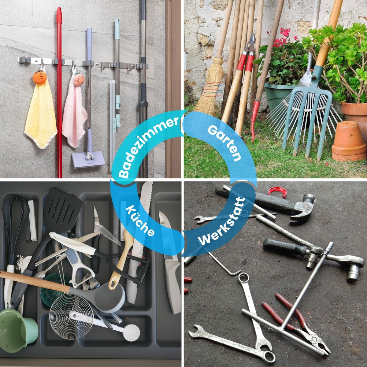 Diese praktischen Besenhalterungen bringen endlich Ordnung in deine Gartenlaube, Garage oder den Schuppen! Im 8er-Set bekommst du robuste Wandhalterungen aus verzinktem 0,7mm Federstahl - absolut korrosionsbeständig und super langlebig. Mit dem enthaltenen Montagematerial kannst du die Halterungen schnell und einfach an der Wand befestigen. Perfekt geeignet für Besen, Schaufeln, Rechen und andere Gartengeräte, aber auch für verschiedene Werkzeuge. Das platzsparende Design optimiert deinen Stauraum und hält alles ordentlich an seinem Platz. Kein lästiges Suchen mehr - alle Geräte sind griffbereit und übersichtlich aufgehängt. Die schwarze Farbe sieht dabei auch noch richtig gut aus! Einfach montieren, Geräte einhängen und sich über die neu gewonnene Ordnung freuen. Für alle, die ihre Arbeitsumgebung effizient und aufgeräumt halten wollen - ein absolutes Must-Have!