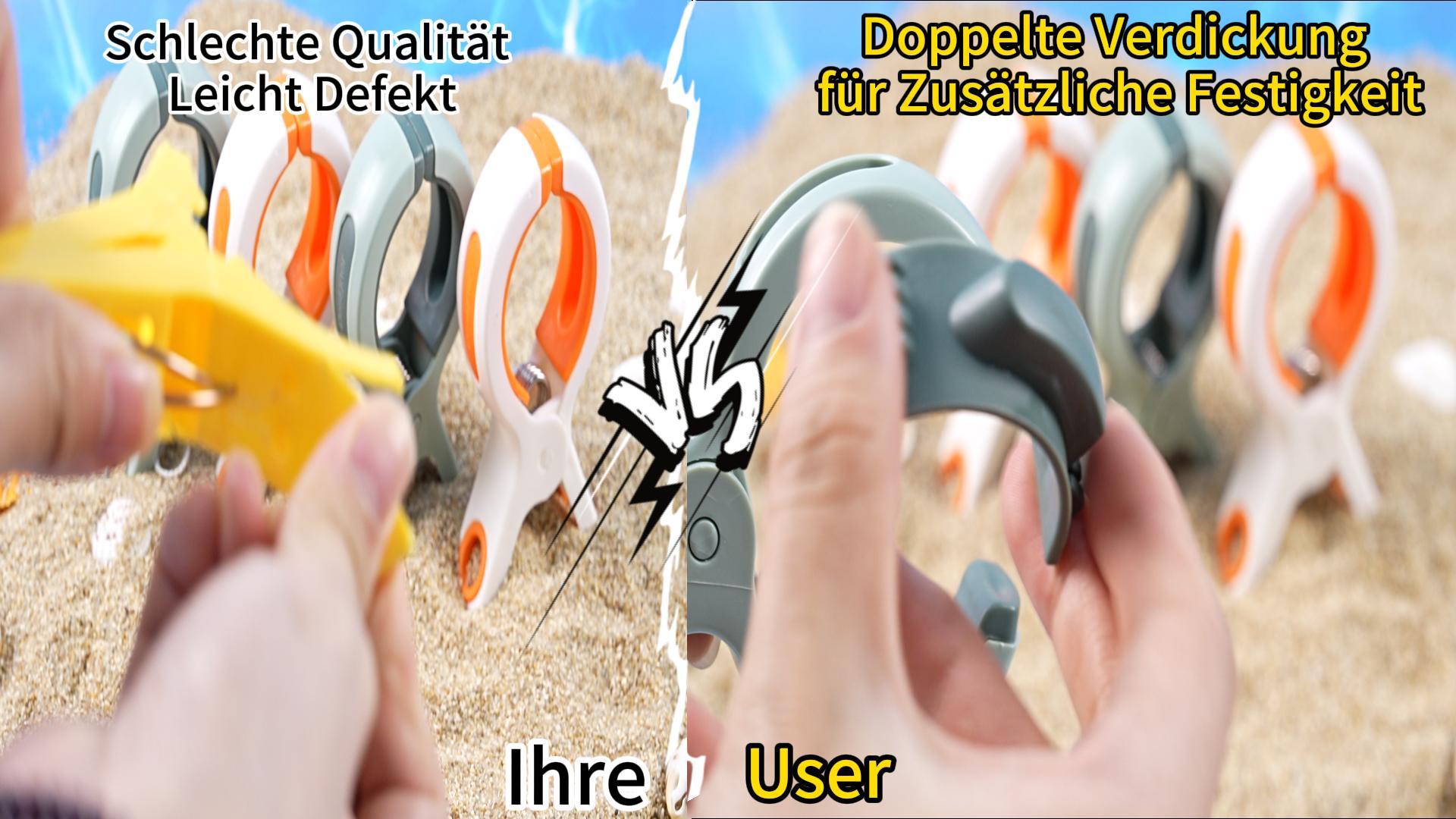 Schluss mit fliegenden Handtüchern am Strand! Diese 8 extra großen Klammern halten dein Handtuch sicher auf der Liege fest - selbst bei starkem Wind. Die spezielle Federkraft sorgt für bombenfesten Halt. Aus robustem Kunststoff gefertigt, sind sie rostfrei und wetterbeständig. Perfekt für den Pool, Strand, Camping oder Garten. Aber nicht nur für Handtücher - auch Bettwäsche, Kleidung oder Planschdecken bleiben damit sicher an Ort und Stelle. Die rutschfesten Zacken greifen selbst in feuchtes Textil. Praktisches 8er-Set - genug für die ganze Familie oder mehrere Liegen. Einfach zu handhaben, platzsparend zu verstauen. Endlich entspannt sonnenbaden, ohne ständig dem Handtuch hinterherzurennen. Ein Muss für jeden Sommer!
