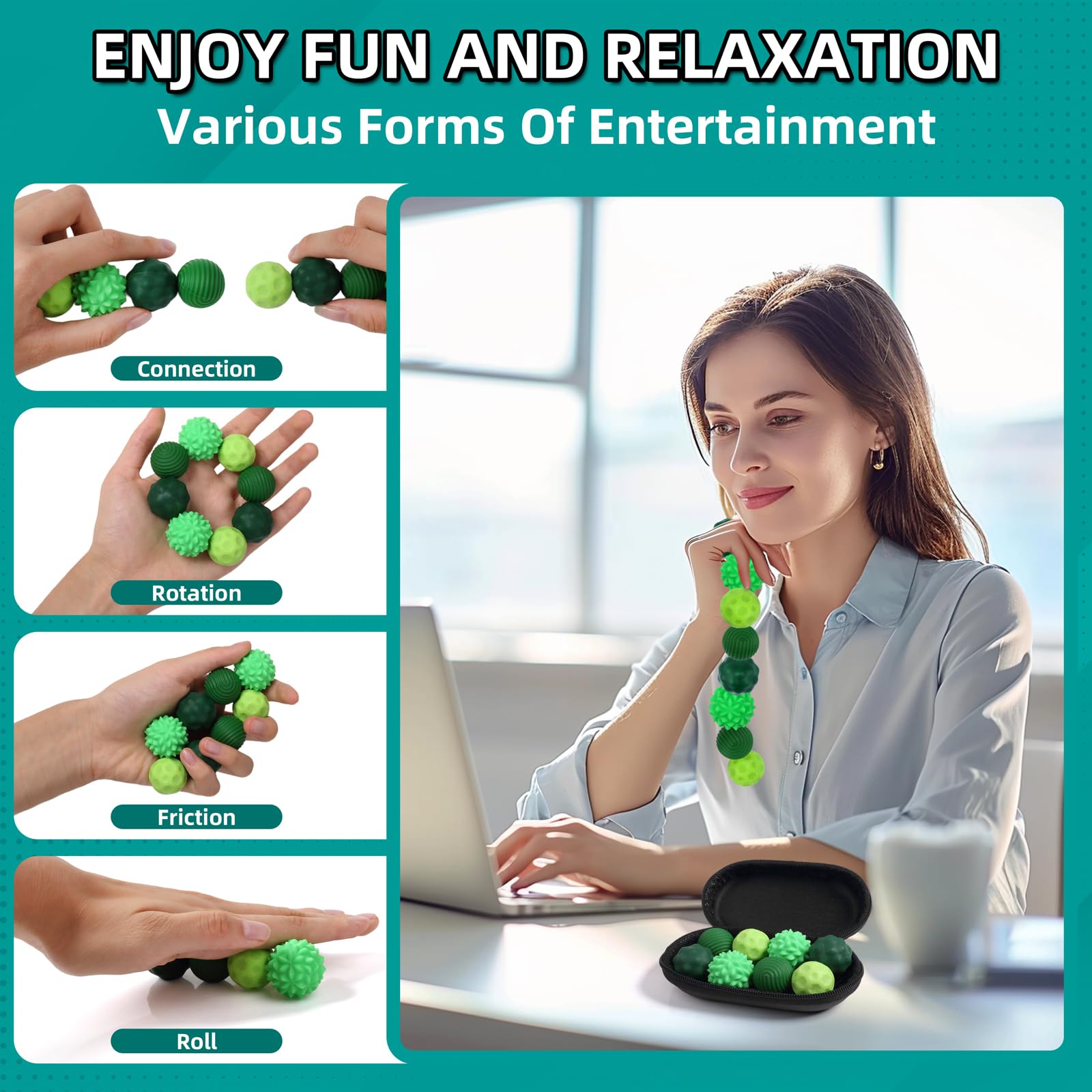 Omg, diese Fidget Toys sind suchtmachend! 8 Stück in grünem Silikon mit Magnetkugeln drin. Super zum Stressabbau - einfach drehen, kneten, massieren. Hilft gegen Nägelkauen, Zappeln oder Unruhe. Vier verschiedene Texturen für mild bis stimulierend. Macht total Spaß und fördert die Fingerfertigkeit. Kommt in ner Aufbewahrungsbox, perfekt für unterwegs. Ideal für Erwachsene und Kinder. Ein fantastisches Geschenk für jeden, der mal abschalten will. Einfach reinigen und immer wieder verwenden. Einfach genial!