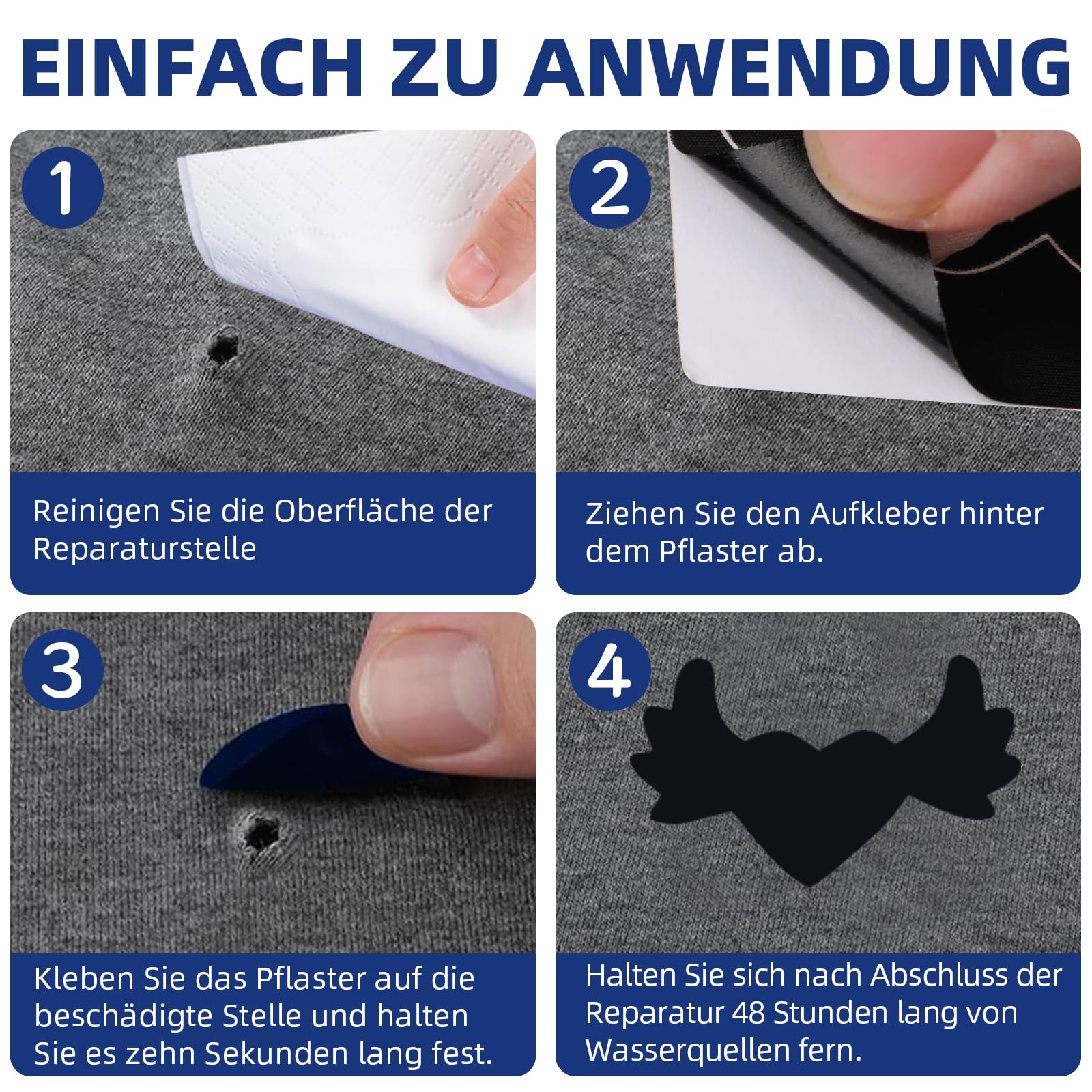 Das Set enthält 8 selbstklebende Flicken in 4 verschiedenen Formen - da ist für jeden Riss der passende Patch dabei. Einfach die Stelle um das Loch herum säubern, den passenden Flicken aussuchen, Schutzfolie abziehen und fest aufdrücken. Nach 30 Sekunden Haltedruck ist die Reparatur fertig - komplett ohne Nähen oder Bügeln!