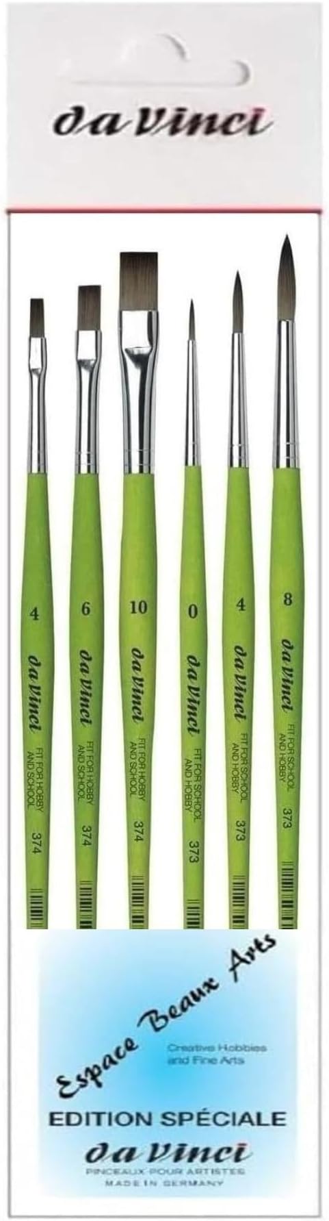 Hallo Künstler und Hobbymalere! Dieses DaVinci Malerpinsel-Set ist genau das richtige für anspruchsvolle Malarbeiten. 8 hochwertige Pinsel in verschiedenen Formen und Größen - rund .2, 5, 8 und flach 2, 4, 6, 8, 10. Alles Made in Germany und das merkt man der Qualität an! Die Pinselhaare sind superweich und geben die Farbe gleichmäßig ab. Perfekt für Acryl, Aquarell, Öl oder Gouache. Ob feine Details oder große Flächen - mit diesem Set bist du für jedes Projekt gerüstet. Die Pinsel liegen gut in der Hand und ermüden nicht auch bei langen Mal-Sessions. Die Serie 303 und 304 sind echte Klassiker und bei Profis sehr beliebt. Espace Beaux Arts steht für Qualität und das sieht man diesen Pinseln an. Nach dem Gebrauch einfach gut auswaschen und sie halten ewig! Super als Geschenk für kreative Menschen oder einfach um deine eigene Ausstattung zu erweitern. Egal ob du Anfänger oder Profi bist - mit diesen Pinseln machst du nichts falsch. Die Investition lohnt sich, denn gute Pinsel machen wirklich einen Unterschied beim Malen! Also worauf wartest du? Dein nächstes Kunstwerk wartet schon!