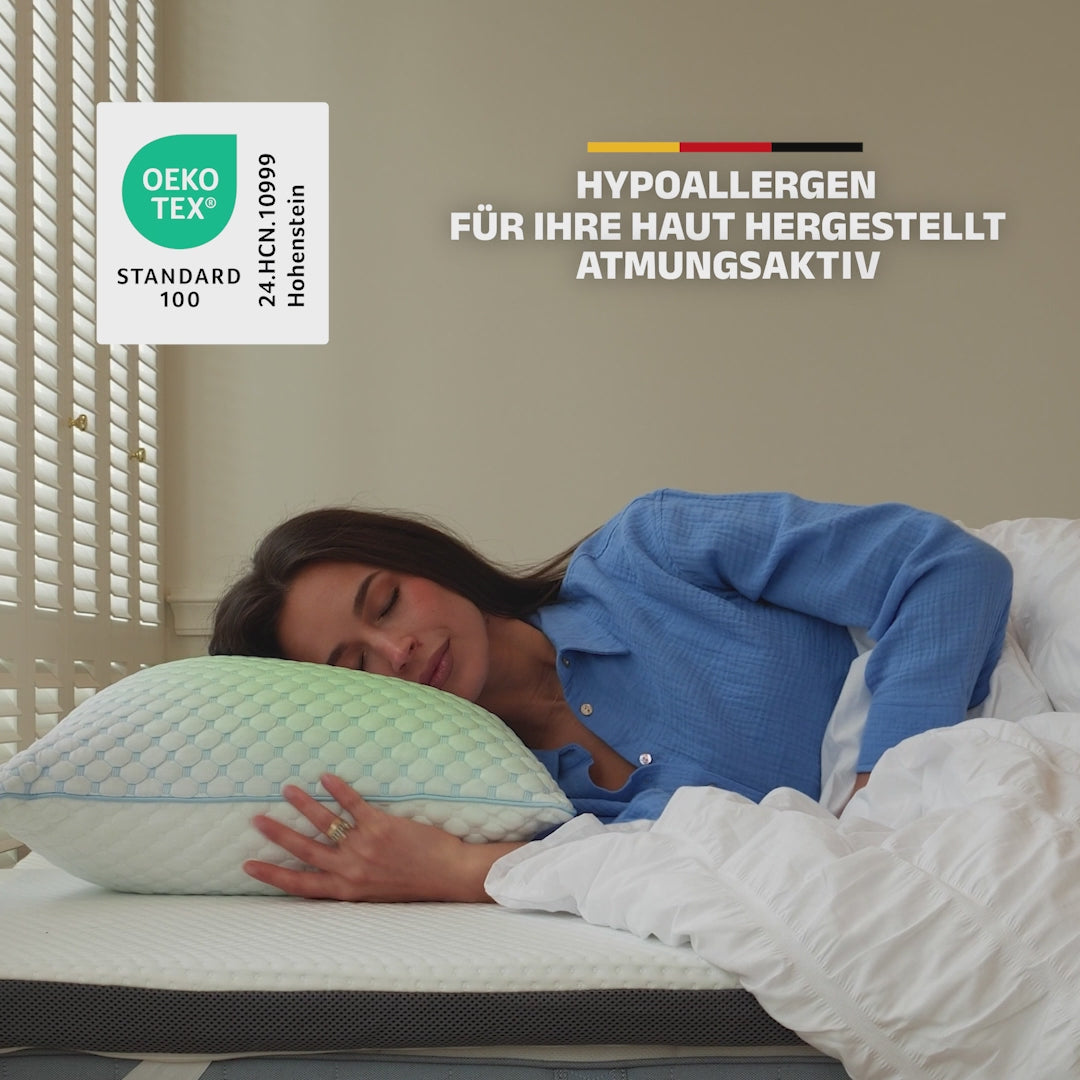 Mit Gel-Technologie und atmungsaktiver Bambusviskose bleibt dein Kopf angenehm kühl. Perfekt für warme Nächte! OEKO-TEX zertifiziert und hypoallergen - auch für Allergiker geeignet.