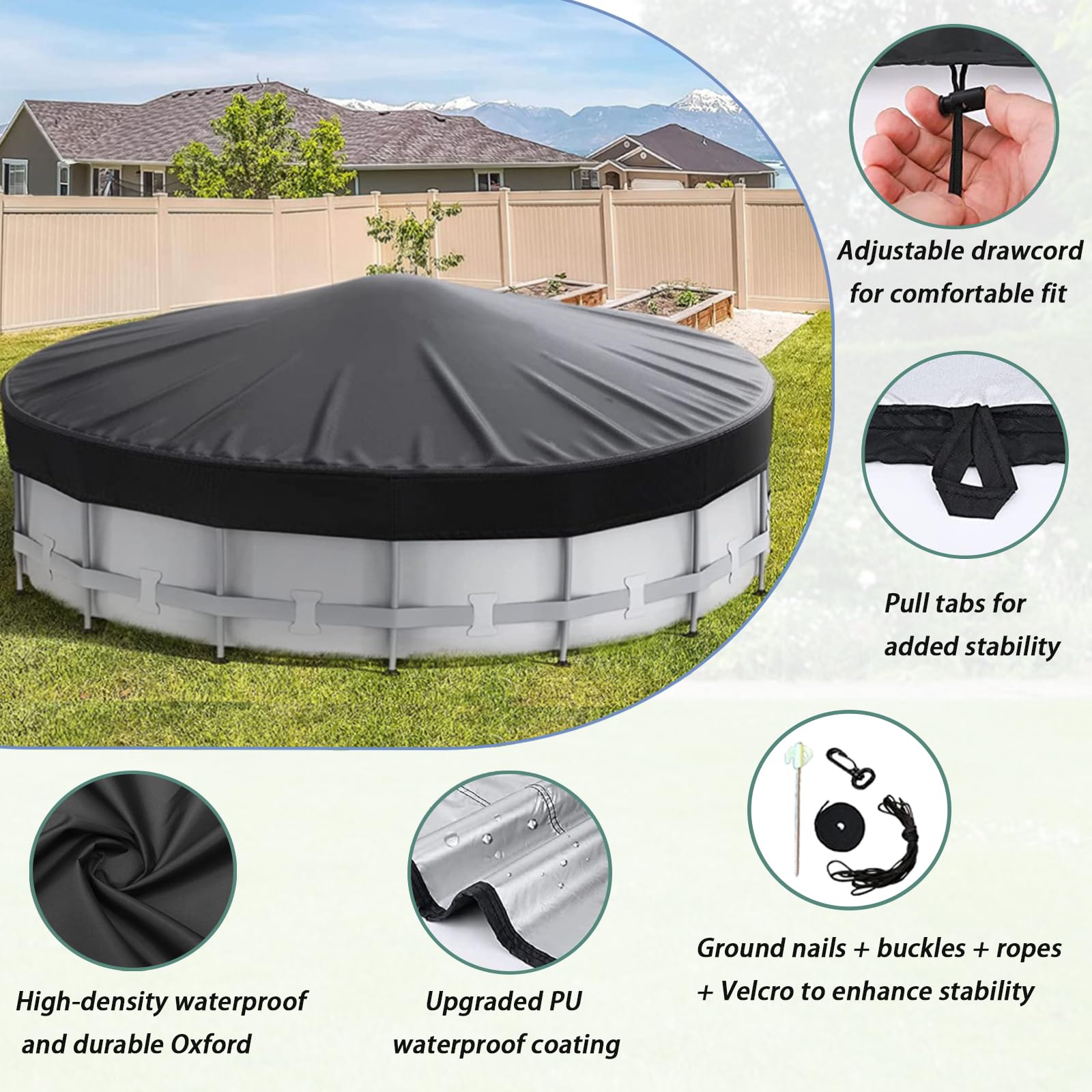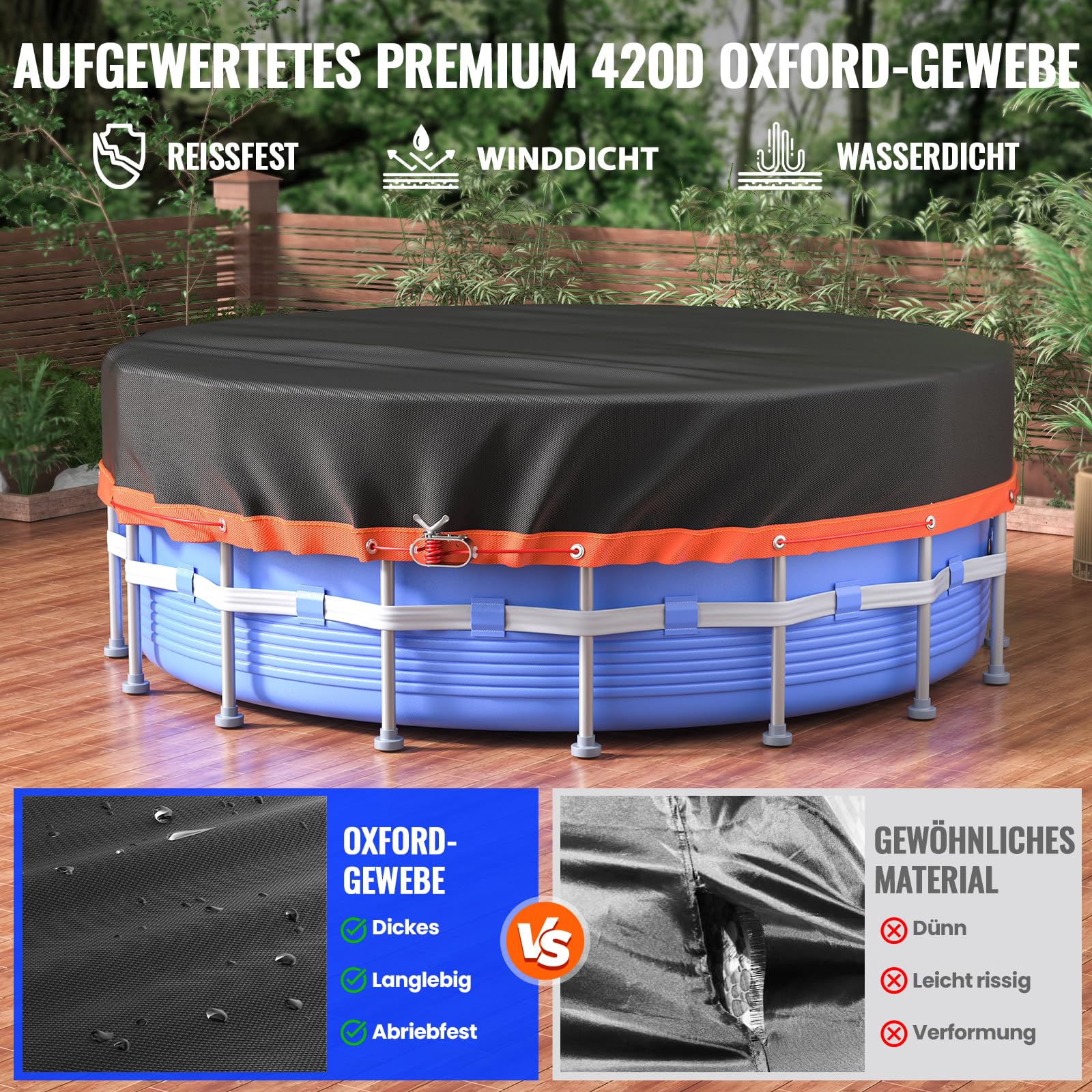 Diese praktische Poolabdeckung hält deinen Pool sauber und warm! Mit 82cm Durchmesser perfekt für viele runde Pools. Aus robustem Oxford-Gewebe - wasser- und staubdicht. Der verstellbare Kordelzug sorgt für perfekten Sitz. Die blaue Farbe absorbiert Sonnenenergie und hält das Wasser länger warm. Reduziert die Verdunstung - spart Wasser und Energie! Einfach über den Pool legen und zuziehen - fertig! Perfekt für Kinderpools, Hundepools oder kleine Aufstellpools. Schützt vor Laub, Insekten und Schmutz. Mach die Poolpflege leichter und genieße jederzeit sauberes Wasser! Hol sie dir und hab mehr Zeit zum Schwimmen statt zum Putzen!