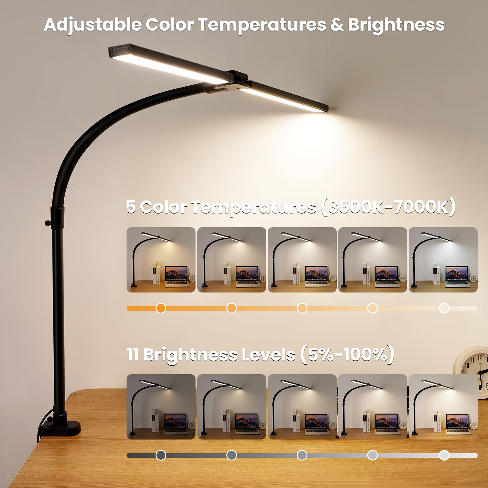 Diese Schreibtischlampe ist der absolute Arbeitsplatz-Held! Mit 85,5cm Spannweite beleuchtet sie deinen ganzen Tisch! Doppelköpfe mit 1600 Lumen - richtig hell aber augenschonend! 5 Farbtemperaturen von warm bis kalt - perfekt für jede Tageszeit! Stufenlos dimmbar von 10% bis 100%! Timer-Funktion - schaltet sich nach 1 Stunde aus! Memory-Funktion - merkt sich deine Einstellungen! Mit fester Klemme - hält bombenfest! Mach dein Homeoffice zum perfekten Arbeitsplatz!