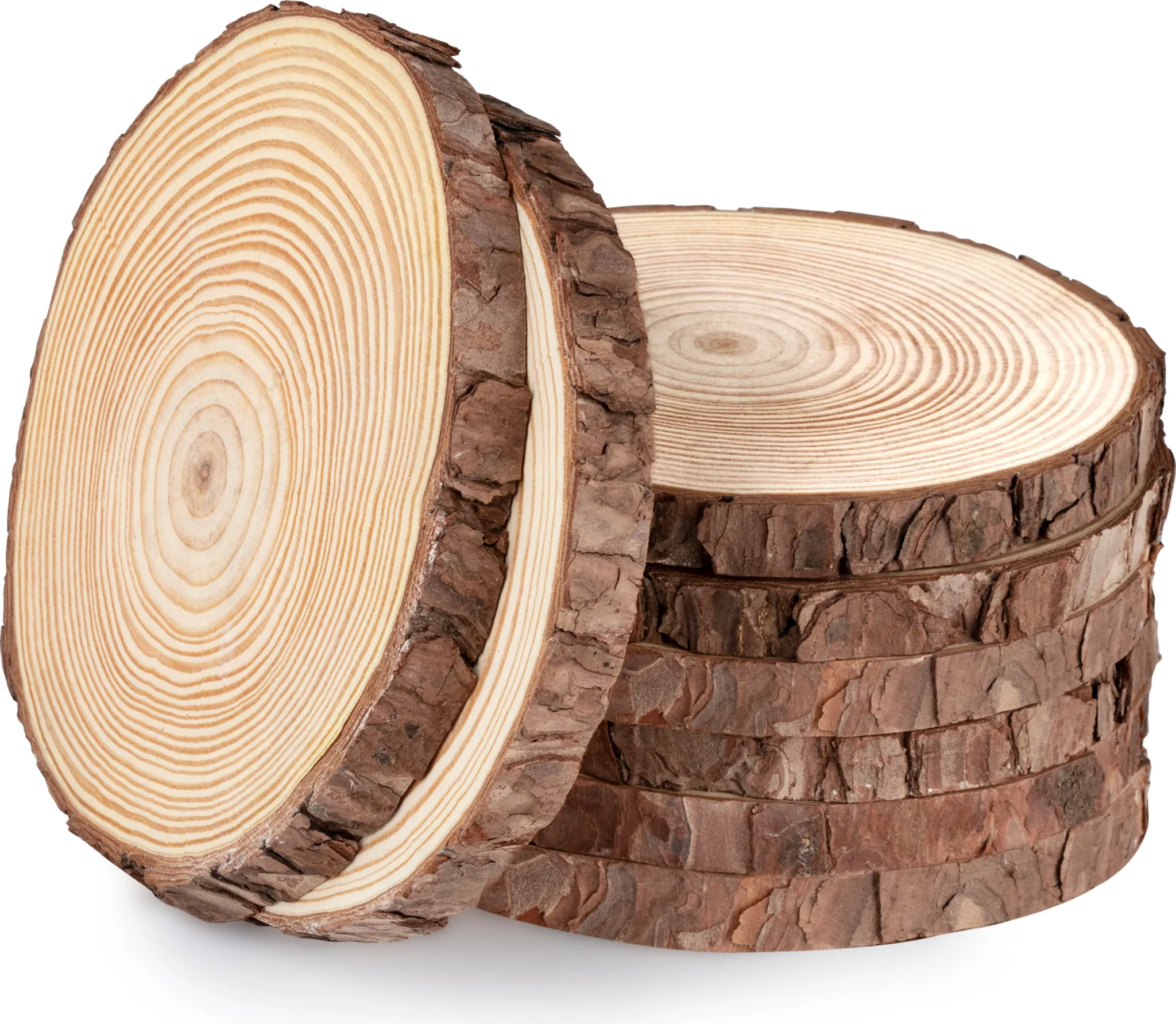 Jede Scheibe ist aus naturbelassenem Kiefernholz mit original Rinde. Sieht total natürlich und rustikal aus - genau das, was man für coole DIY-Projekte braucht.
