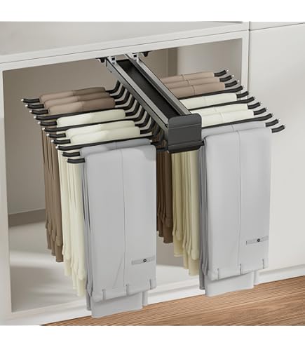 Endlich Ordnung im Kleiderschrank! Dieser ausziehbare Hosenhalter hat 9 Stangen für bis zu 16kg Hosen, Krawatten oder Schals. Aus Edelstahl und Aluminium, super stabil. Die beflockten Stangen schützen deine Hosen vor Falten und die runden Enden kratzen nicht. Einfach seitlich im Schrank montieren und platzsparend deine Hosen ordentlich aufhängen. Links-Montage, inklusive allem Montagezubehör! Tragkraft: 16kg • 9 Stangen • Material: Edelstahl/Aluminium • Für Hosen, Krawatten • Platzsparend • Mit Montagezubehör