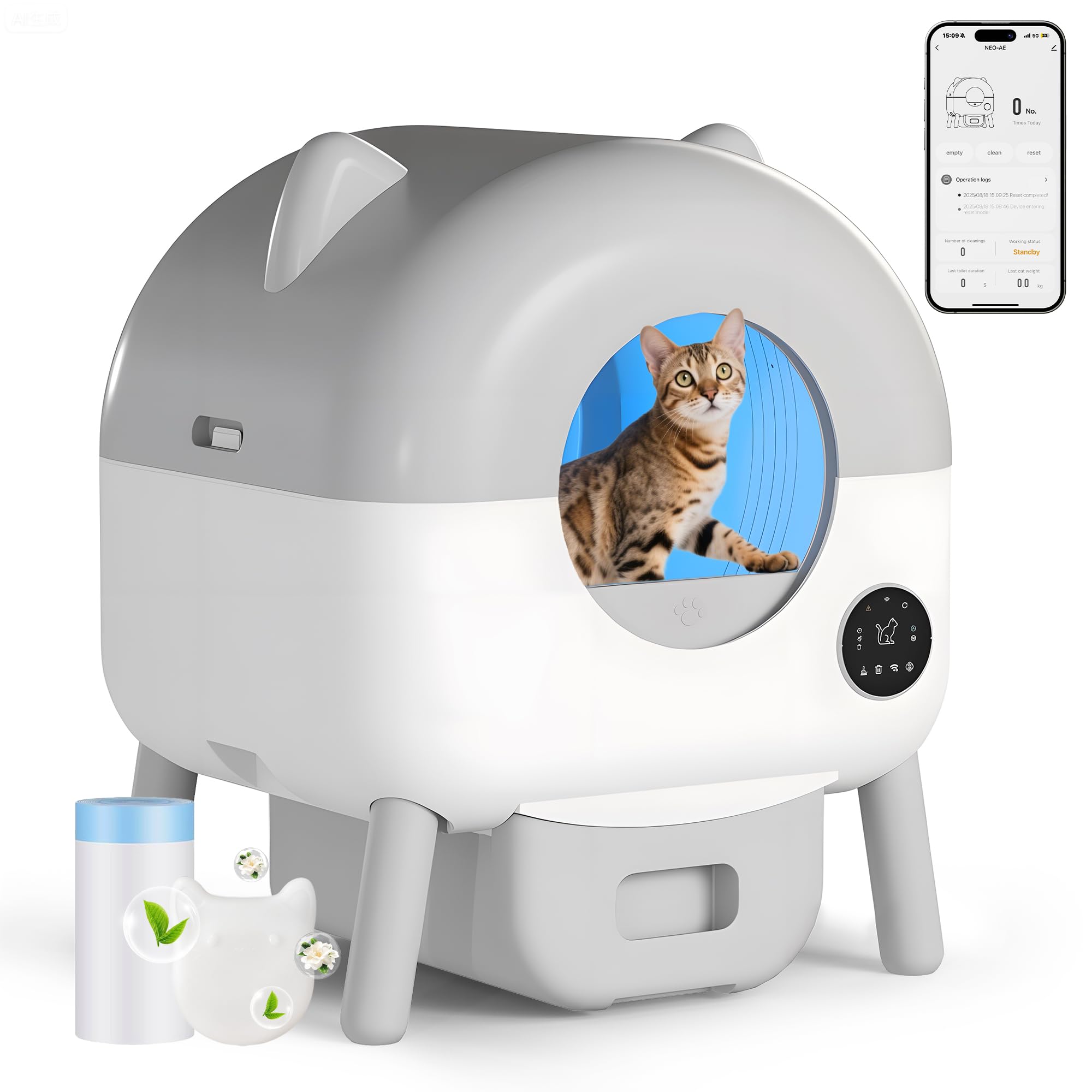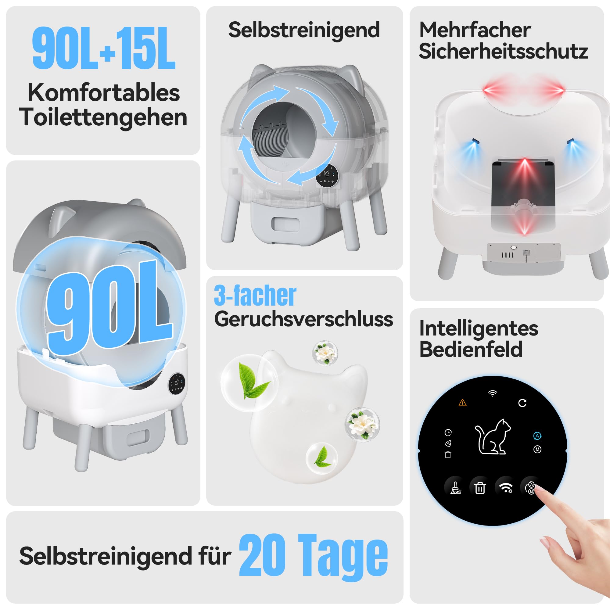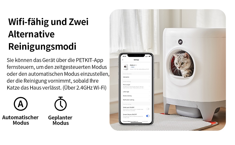 Smart Features:• App-Steuerung per WLAN• Automatische oder zeitgesteuerte Reinigung• Gesundheitsmonitoring (Gewicht, Häufigkeit)• Sicherheitssensoren stoppen bei Katzennähe• Integrierte Duftstoffe gegen Gerüche