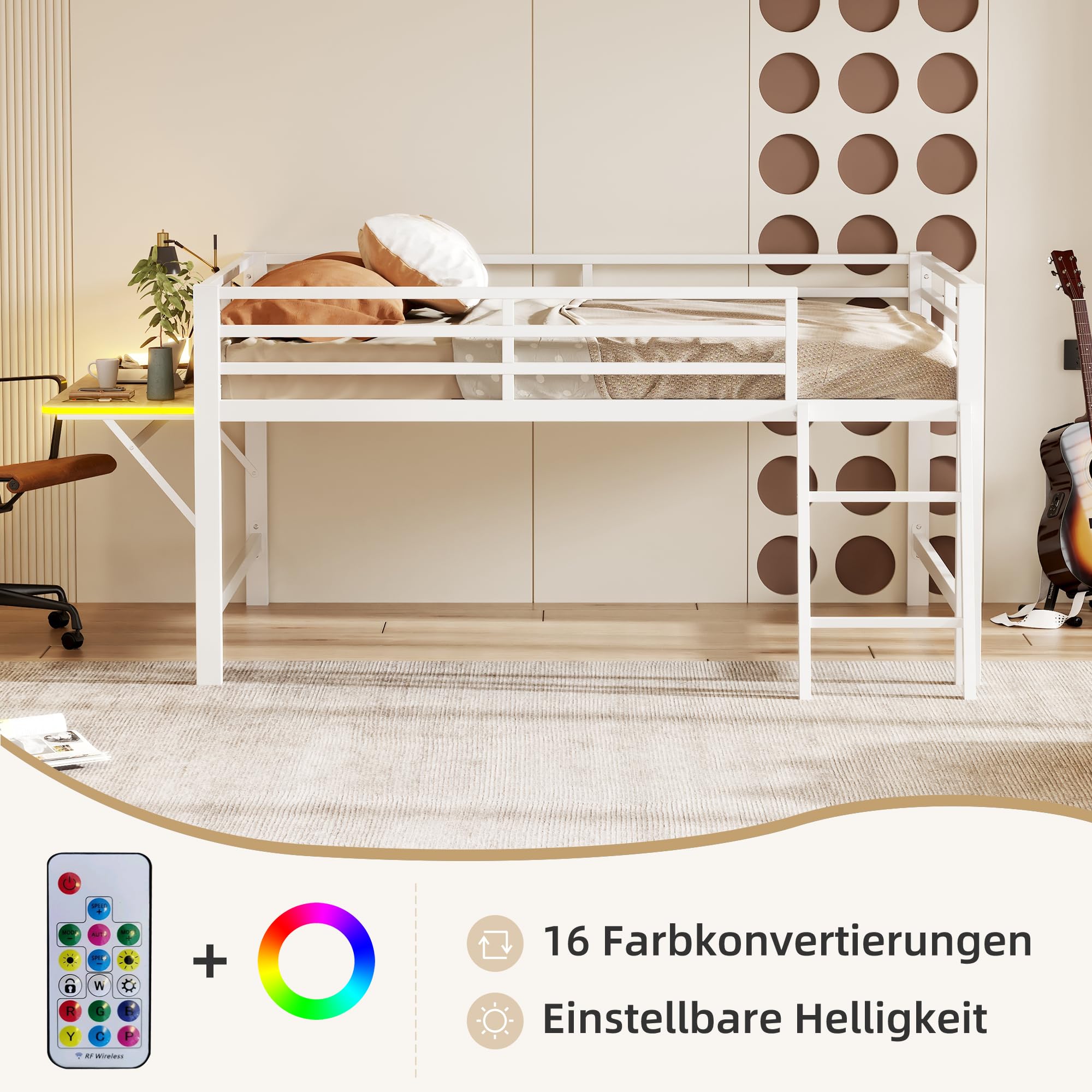 Wow, dieses Hochbett ist ja der absolute Traum für jedes Kind! Mit 90x200 cm Standardmaß und nem integrierten Schreibtisch - da macht sogar Hausaufgaben machen Spaß! Das coole LED-Licht mit Fernbedienung kann verschiedene Farben und Stimmungen, von warm bis cool. Der Rausfallschutz gibt dir als Eltern ein sicheres Gefühl - da kann nachts nichts passieren. Aus stabilem Metallrahmen und MDF-Platten gebaut, hält das Bett was aus. Die Leiter ist fest installiert, also kein Wackeln beim Hochklettern. Super platzsparend - unter dem Bett ist noch jede Menge Stauraum oder Spielbereich. Wächst mit deinem Kind mit und ist jahrelang nutzbar. Wird in zwei Paketen geliefert (können auch mal nacheinander kommen), aber der Aufbau lohnt sich! Perfekt fürs Kinderzimmer, ob für ein Kind oder wenn Geschwister sich das Zimmer teilen. Mit diesem Bett wird das Schlafzimmer zum Lieblingsraum! Für Jungs und Mädchen gleichermaßen geeignet. Einfach aufbauen, Matratze rein und dein Kind hat sein eigenes kleines Reich in der Höhe!
