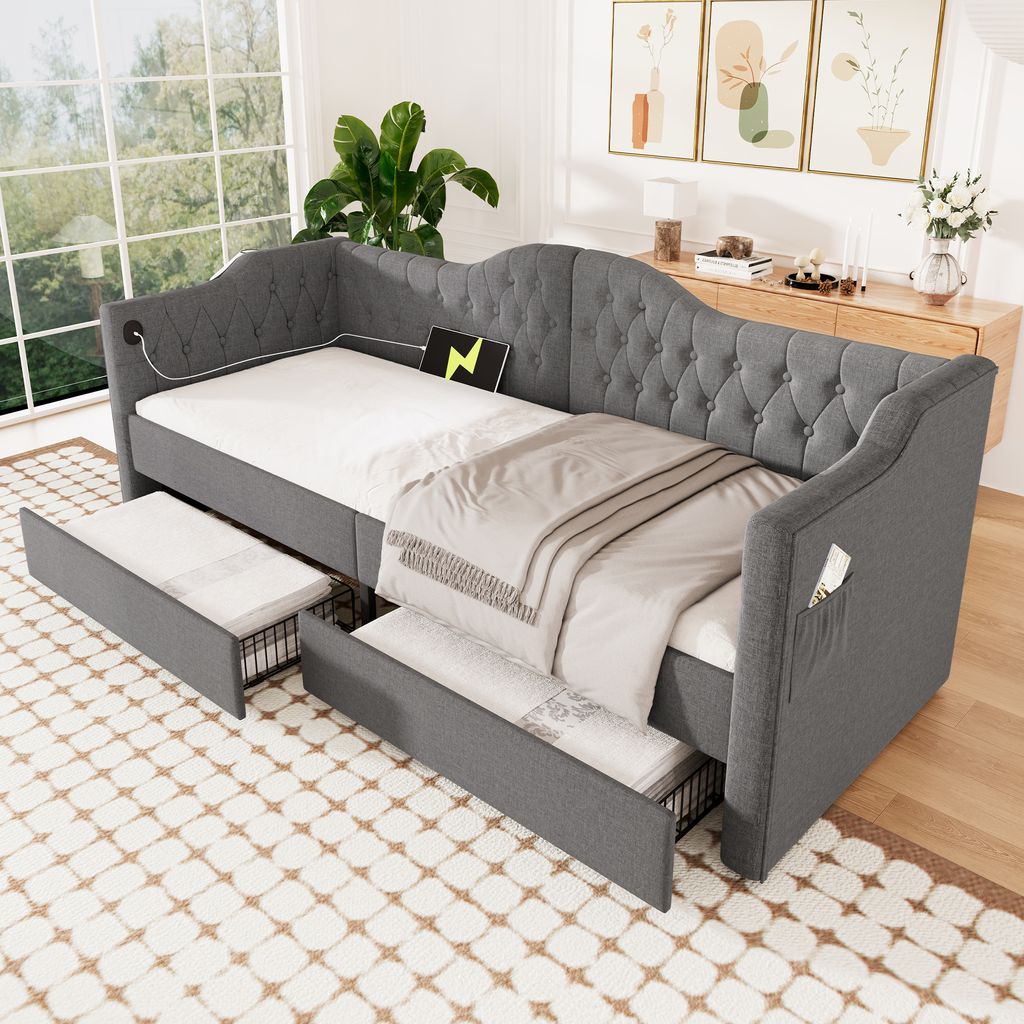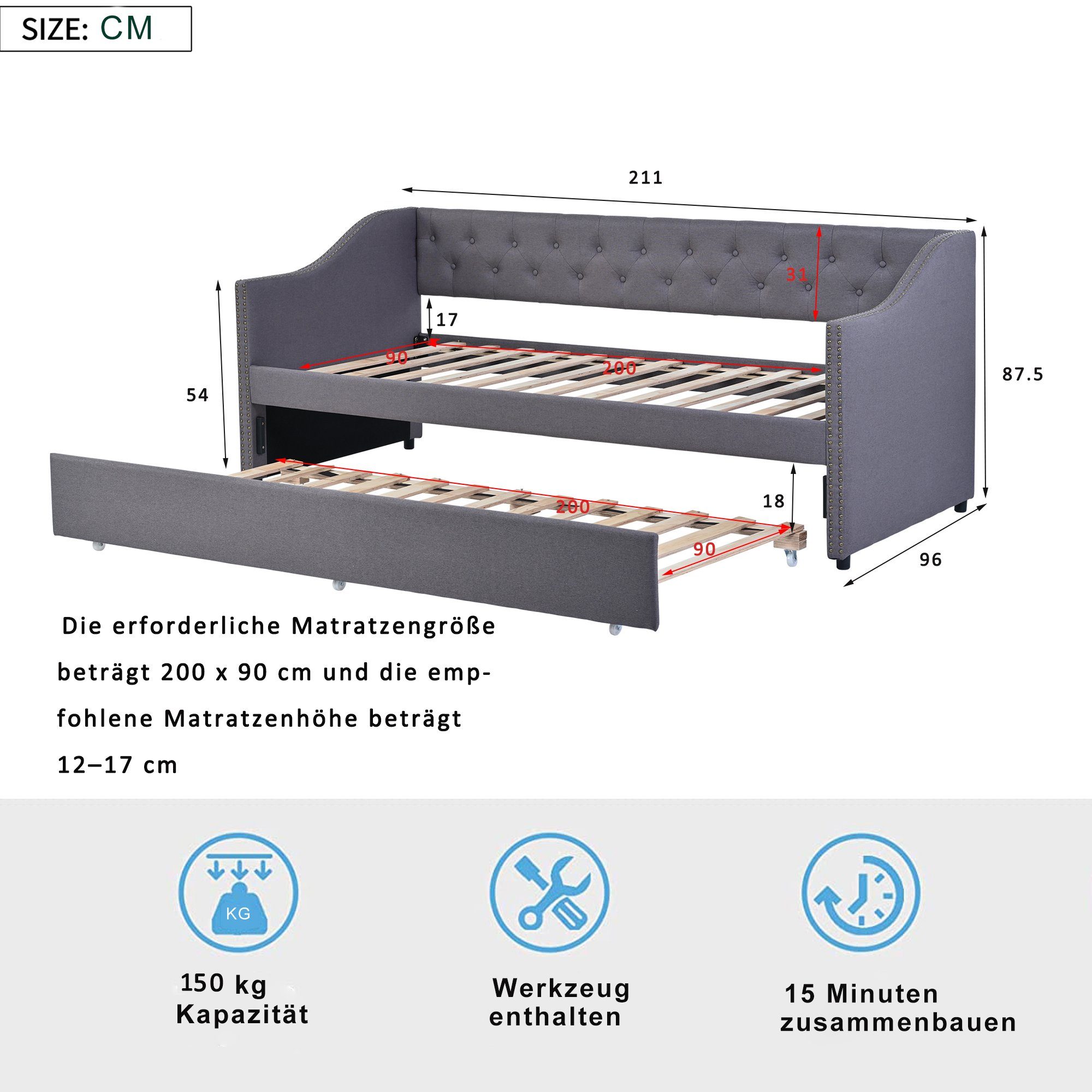 Dieses Schlafsofa ist einfach genial! 90x200 cm groß, mit hydraulischem Stauraum unter dem Bett - perfekt für Bettwäsche, Kleidung oder was auch immer du verstecken willst. Das samtige Polster ist superweich und hautfreundlich. Das Kopfteil hat ein praktisches Nachtlicht, USB- und Type-C-Anschlüsse zum Aufladen - dein Handy ist immer in Reichweite. Plus Ablageflächen für Bücher, Gläser oder dein Lieblingsbuch. Seitliche Fächer bieten zusätzlichen Stauraum. Das gestreifte Design sieht einfach klasse aus! Montage nötig, aber mit Anleitung machbar. Belastbar bis 150 kg, empfohlene Matratzenstärke 8-12 cm. Perfekt für Gästezimmer, kleine Wohnungen oder als stylisches Hauptbett. Farben: Beige, Dunkelgrau oder Hellgrau - such dir deinen Favoriten aus!