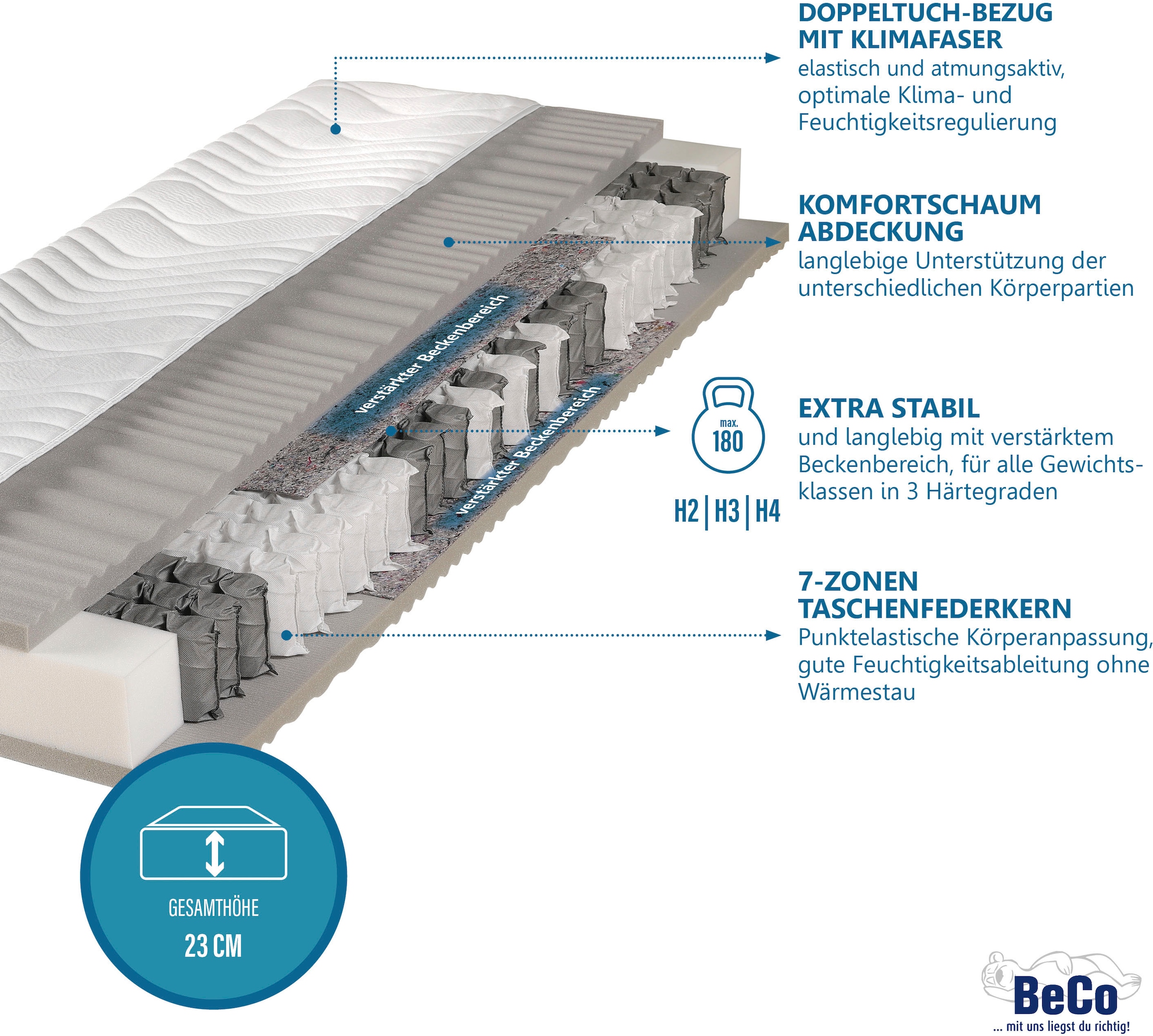 BeCo Royal Komfort Gel Matratze 90x200cm H2 - Mit Integriertem Topper & Taschenfederkern