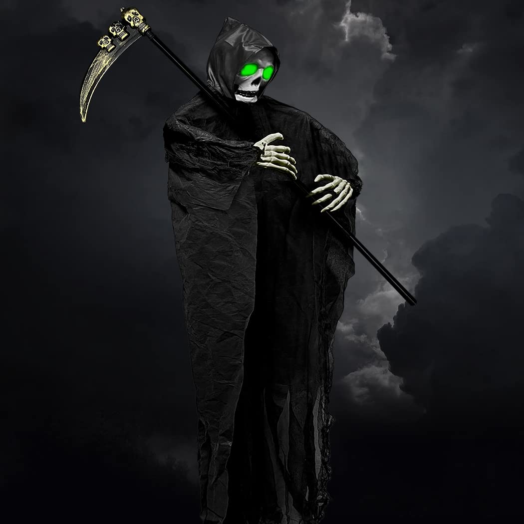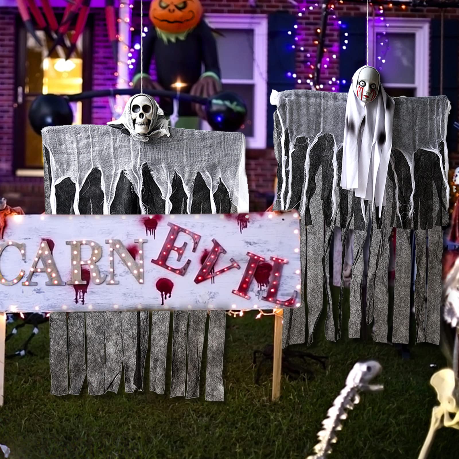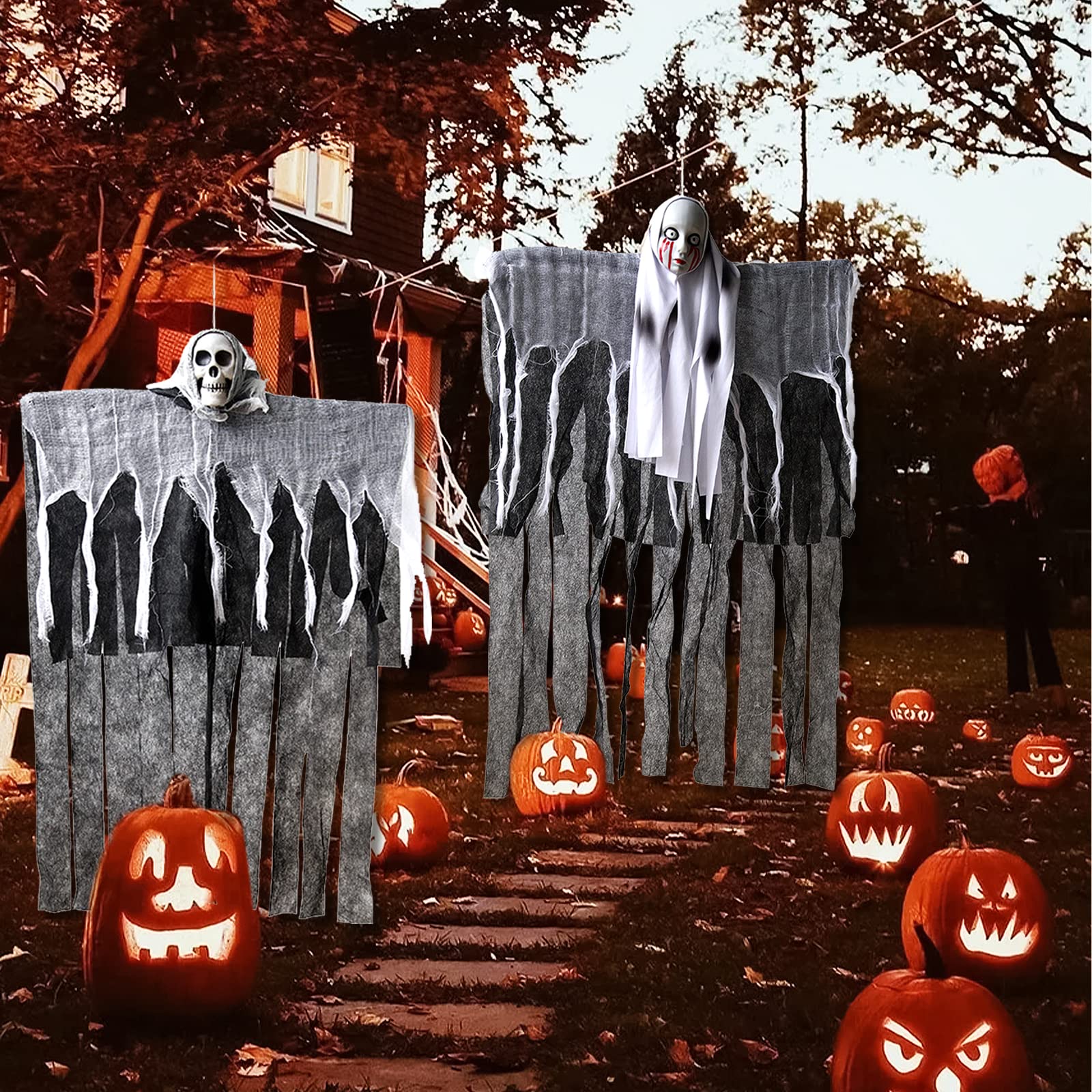 Mach dein Zuhause zur Gruselburg! Diese beiden gruseligen Sensenmänner sind perfekt für Halloween. Mit 92x56cm Größe sind sie ein echter Hingucker an Türen, Fenstern oder im Garten. Aus robustem Hartplastik und hochwertigem Leinen - wiederverwendbar und faltbar für einfache Lagerung. Einfach aufhängen und sofort ist die gruselige Stimmung da! Ohne Werkzeug montierbar, einfach formen und aufhängen. Perfekt für Halloween-Partys, Vorgärten oder um Nachbarn zu erschrecken. Die Schnur oben macht das Aufhängen super einfach. Hol dir den ultimativen Halloween-Spaß!