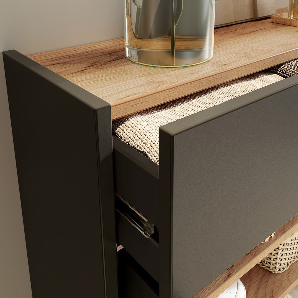 Ordnung im Eingangsbereich war noch nie so schön! Dieser Landhaus-Schuhschrank in Graphit mit Artisan-Eiche-Optik ist der perfekte Stauraum für Schuhe und Accessoires. Mit 93x102x41cm bietet er reichlich Platz und hat sogar eine integrierte Sitzbank. Die Soft-Close-Funktion sorgt für sanft schließende Schubladen und Türen. Aus hochwertigen Materialien gefertigt und extrem kratzfest. Einfache Montage mit bebilderter Anleitung - du brauchst nur einen Schraubenzieher! Geliefert per Spedition mit 2-Mann-Handling bis zur Aufstellstelle. Mach deinen Flur zur Wohlfühloase - stylisch und praktisch zugleich!