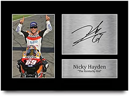 Ein Muss für jeden echten MotoGP-Fan! Dieses hochwertige A4-Rahmenbild zeigt den legendären Nicky Hayden in Action - komplett mit gedruckter Signatur für den echten Sammler-Look. Gerahmt in einem schlanken, schwarzen Polycarbonat-Rahmen der perfekt zum mattschwarzen Passepartout passt. Die professionelle Montage auf 1400 Mikron starkem Karton gibt dem Bild Stabilität und eine glänzende Oberfläche. Das Metall-Effekt-Namensschild unterstreicht die Exklusivität dieses Stücks. Perfekt als Geschenk für Geburtstage, Weihnachten oder einfach so - jeder Motorsport-Enthusiast wird sich darüber freuen! Leicht genug für einfaches Aufhängen, aber schwer genug um Qualität zu vermitteln. Ob im Wohnzimmer, Büro oder Man-Cave - dieses Bild bringt Rennsport-Flair in jeden Raum. Einfach auspacken, aufhängen und die Erinnerung an einen der größten Rennfahrer aller Zeiten genießen!