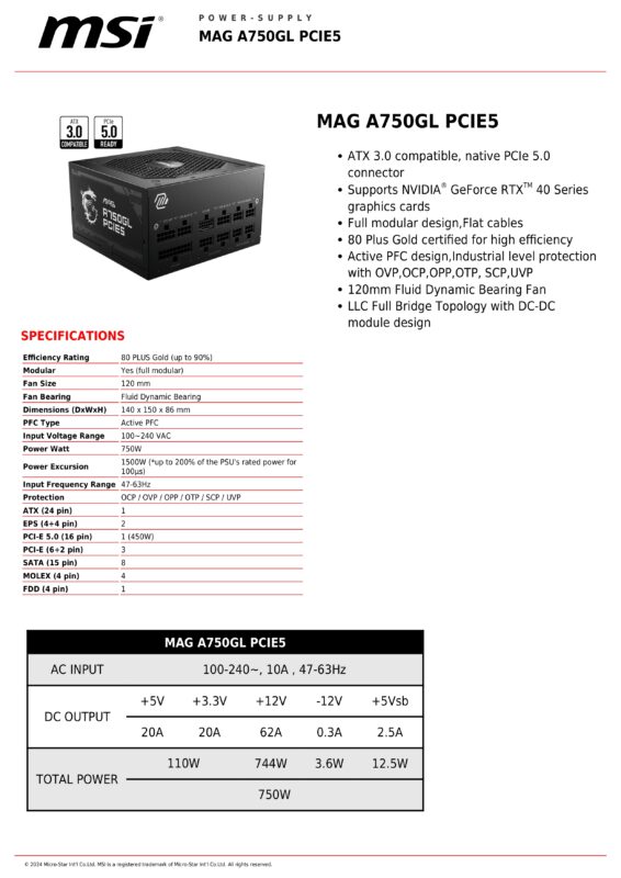 MSI MAG A750GLS PCIE5 Netzteil 750W - 80 Plus Gold & ATX 3.1 Für Gaming-PCs