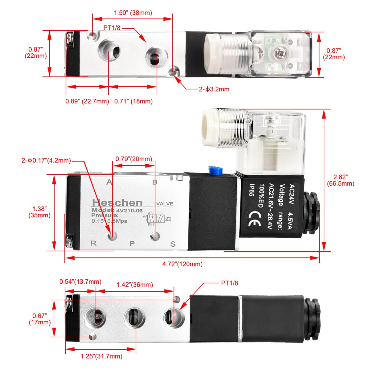 • Heschen Magnetventil 4V210-06 AC24V - 5/2 Wege Pneumatisches Ventil PT1/8