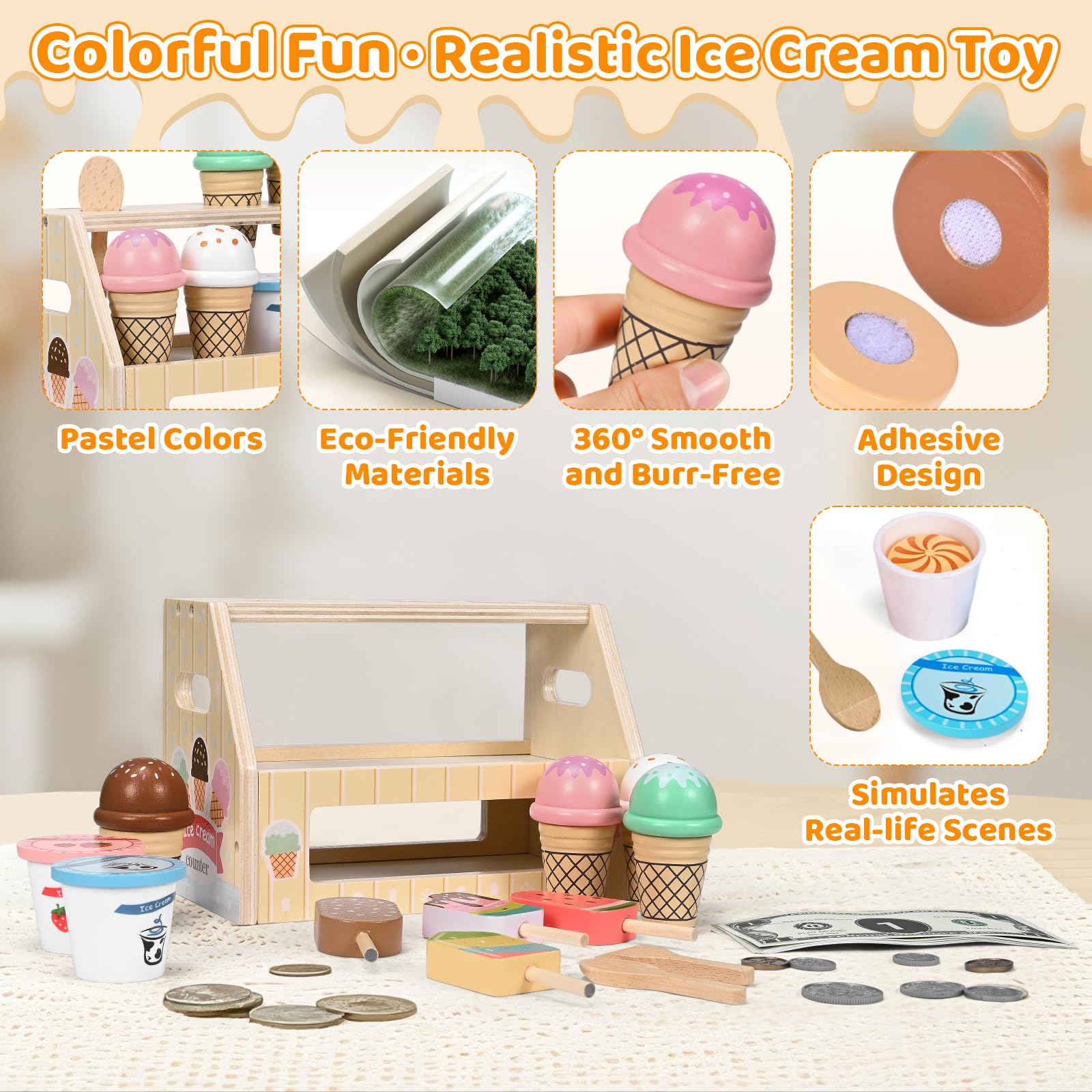 Eis, Eis, Baby! Dieses süße AIYAPLAY Holz-Eisdiele-Set mit 18 Teilen lässt Kinderherzen höher schlagen. Alles dabei: verschiedene Eissorten, Süßigkeiten und Löffel für realistisches Spielvergnügen. Aus kinderfreundlichem MDF mit abgerundeten Ecken - sicher für kleine Hände. Fördert Rollenspiel, Fantasie und motorische Fähigkeiten. Maße: 42x20x24,5 cm - etwas Montage nötig, aber einfach. Perfektes Geschenk für Jungen und Mädchen von 2-5 Jahren - verpackt in hübscher Geschenkbox. Spielerisch lernen und Spaß haben!
