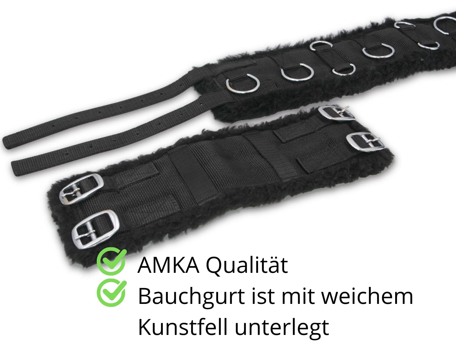 Professionelles Longiertraining für dein Pferd! Der AMKA Longiergurt mit weicher Kunstfell-Unterlage schont den Pferderücken. Mit 12 Ringen in verschiedenen Positionen für vielseitige Trainingsmöglichkeiten. Der Bauchgurt ist beidseitig mit je 2 Schnallen versehen und ebenfalls gepolstert. Aus pflegeleichtem Nylon in schwarz mit silberfarbenen Beschlägen. Erhältlich in verschiedenen Größen: Shetty (110-140cm), Pony (135-170cm), Cob/Vollblut (150-190cm), Full/Warmblut (160-200cm), X-Full (178-220cm). So macht das Training Spaß - für Pferd und Reiter!