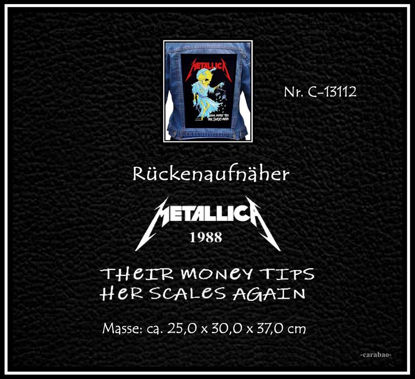 Yeah, Metallica-Fans aufgepasst! Dieser Rückenaufnäher mit dem klassischen '...And Justice For All' Design ist perfekt für deine Kutte. Aus robustem Polyester, 30cm oben, 27cm unten und 36cm hoch - also genau die richtige Größe für den Rücken. Von Halle15Clothes, aber das Originaldesign ist von Razamataz. Exklusiv zum Aufnähen geeignet - also nix mit Aufbügeln, das hält nicht! Nimm dir lieber etwas Zeit und näh ihn ordentlich auf, dann hast du lange Freude daran. Sieht einfach mega aus auf einer schwarzen Kutte - ein echter Hingucker auf jedem Konzert oder Festival. Das Design ist klar und kräftig gedruckt, verblasst nicht so schnell. Ein Muss für jeden echten Metallica-Fan, der seine Jacke aufpeppen will. Mach deine Kutte einzigartig und zeig, welche Band du feierst! Einfach aufnähen und ab aufs nächste Konzert - die Blicke sind dir sicher!