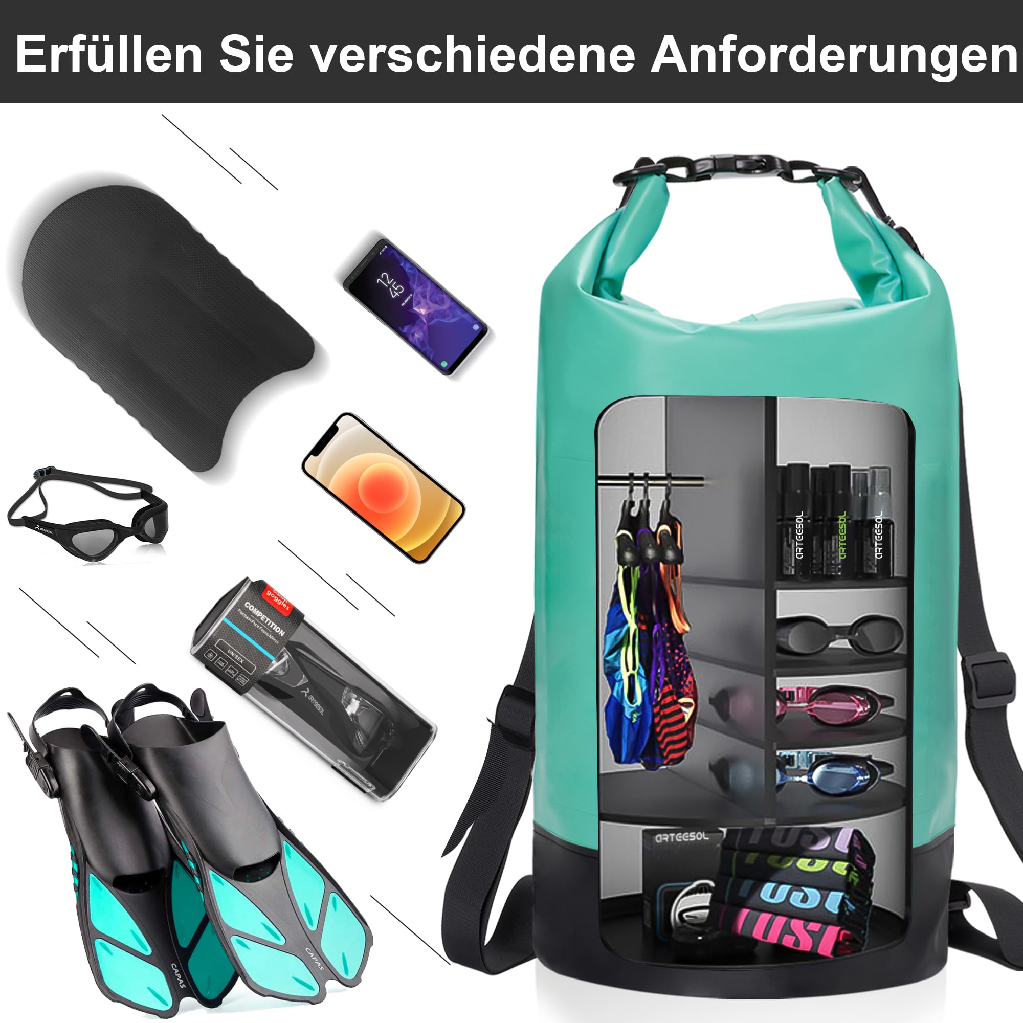 Deine Ausrüstung bleibt garantiert trocken - egal bei welchem Wetter! Die ARTEESOL Dry Bag in verschiedenen Größen (5L, 10L, 20L, 30L) schützt deine Wertsachen zuverlässig vor Wasser. Aus robuster 500 Denier Polyvinyl-Plane mit Hochfrequenzschweißung für maximale Strapazierfähigkeit. Mit zwei verstellbaren Schultergurten - tragbar als Rucksack oder Umhängetasche. Einfache Handhabung: dreimal umklappen, Schnalle schließen, fertig! Perfekt für Kajak, Kanu, Rafting, Angeln, Strandtage oder Wanderungen. Extrem leichtes Design spart Energie und bietet trotzdem Platz für alles Nötige. Dein zuverlässiger Begleiter für alle Outdoor-Abenteuer!