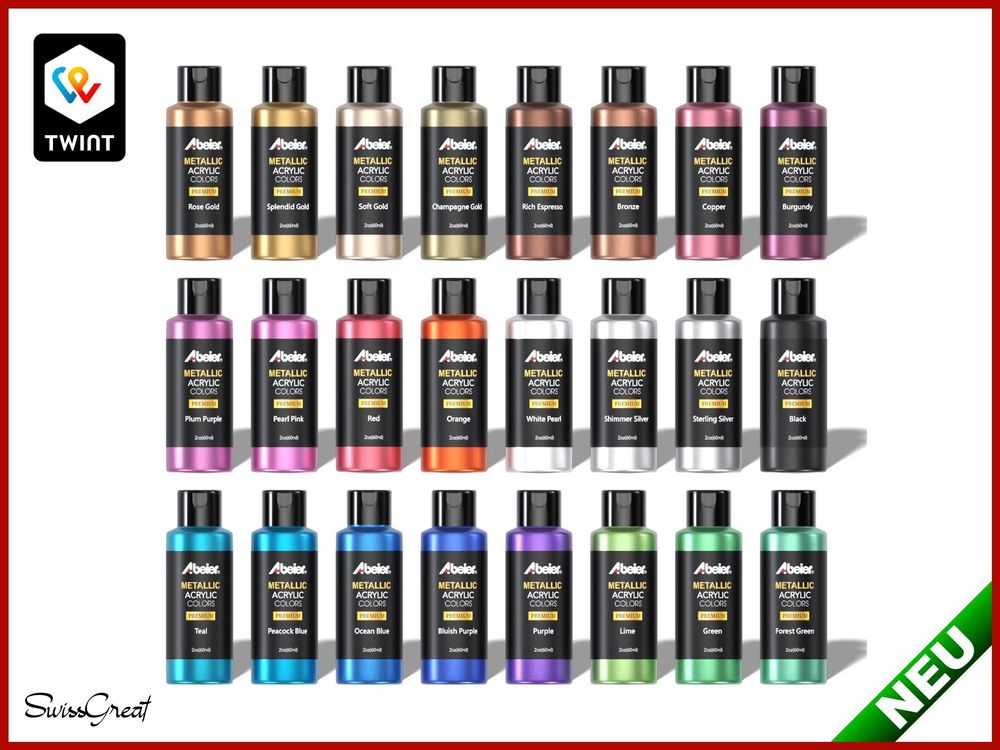 Verleihe deinen Kunstwerken strahlenden Metallic-Glanz! Dieses umfangreiche Set mit 24 Metallic-Acrylfarben in praktischen 60ml Flaschen bietet dir unendliche kreative Möglichkeiten. Die hochpigmentierten Farben decken hervorragend und behalten auch nach dem Trocknen ihren brillanten Schimmer. Enthalten sind klassische Metallic-Töne wie Gold, Silber, Schwarz und Weiß sowie trendige Farben in Rot, Blau, Orange und Grün. Perfekt für Leinwand, Holz, Stein, Glas, Keramik und viele andere Oberflächen. Egal ob du Anfänger oder professioneller Künstler bist - diese Farben lassen sich leicht verarbeiten und mischen. Ungiftig und sicher entsprechend US ASTM D-4236 und EU EN71. Entdecke die Welt des metallischen Malens und erschaffe einzigartige Kunstwerke mit wow-Effekt!