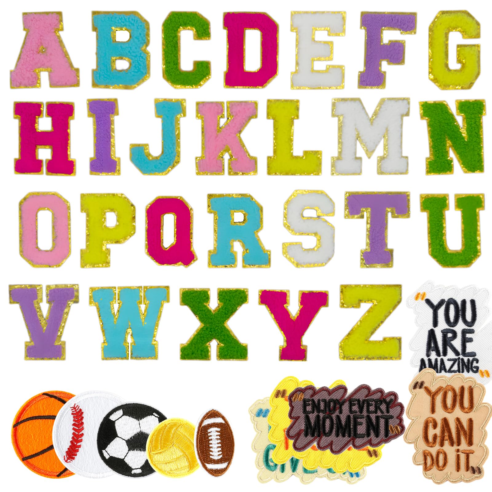 Willst du deine Kleidung personalisieren? Dieses 26-teilige Set mit Buchstaben-Aufnähern von A-Z macht's möglich! Die flauschigen Chenille-Buchstaben haben einen glitzernden Rand und sehen richtig hochwertig aus. Mit 5,8cm Höhe sind sie gut sichtbar aber nicht zu groß. Einfach die Schutzfolie abziehen und auf Kleidung, Taschen, Hüte oder Handyhüllen drücken - kein Nähen oder Bügeln nötig! Perfekt für DIY-Projekte oder um langweilige Kleidungsstücke aufzupeppen. Ob du deinen Namen, Initialen oder coole Sprüche gestalten willst - mit dem kompletten Alphabet hast du alle Möglichkeiten. Deiner Kreativität sind keine Grenzen gesetzt!