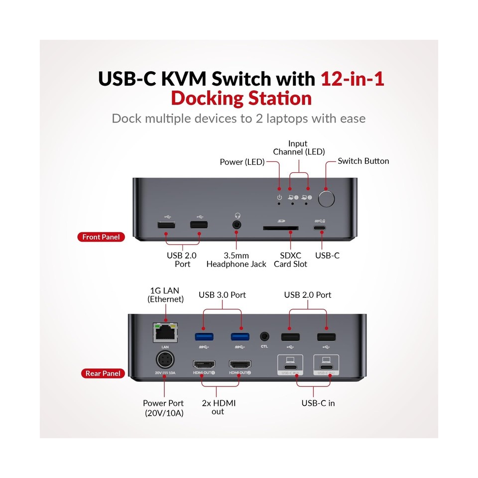Der Alleskönner für deinen Arbeitsplatz! Dieses AV Access KVM Switch Dock verbindet bis zu 3 Computer mit 2 Monitoren - wechsle einfach per Tastendruck zwischen ihnen. Unterstützt 4K@60Hz Auflösung und hohe Refresh Rates bis 240Hz für Gaming. Mit USB-C Anschluss der deinen Laptop mit 65W lädt während Daten übertragen werden. Integriertes LAN für Internet, USB 3.0 Ports für Maus, Tastatur, Webcam und mehr. EDID Emulation sorgt für schnelles Umschalten in 2-3 Sekunden. Perfekt für Home-Office, Gamer oder alle die mehrere Geräte effizient nutzen wollen. Räume deinen Schreibtisch auf und hol dir dieses praktische Dock!