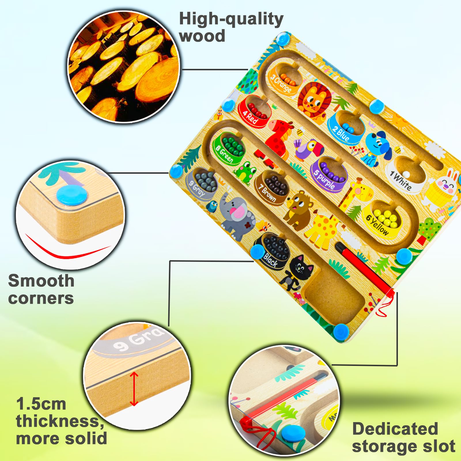Total süßes Lernspiel für Kinder ab 3 Jahren! Mit diesem magnetischen Spiel aus Holz lernen die Kleinen spielerisch Zahlen und Farben kennen. Super sicher gemacht: Die Oberfläche ist glatt und abgerundet, die Farbe ungiftig. Die Magnetkugeln sind hinter Acryl sicher verschlossen - kein Verschluckrisiko! Mit 31x23 cm passt es in jeden Rucksack, ideal für unterwegs. Ob im Restaurant warten oder auf Reisen - beschäftigt die Kinder super. Das Holz ist stabil und die Acrylplatte kratzfest. Ein richtig schönes Geschenk zu Geburtstag oder Weihnachten! Und das Beste: Eltern können mitmachen und so die Bindung stärken. Macht nicht nur Spaß, sondern fördert auch noch die Entwicklung.