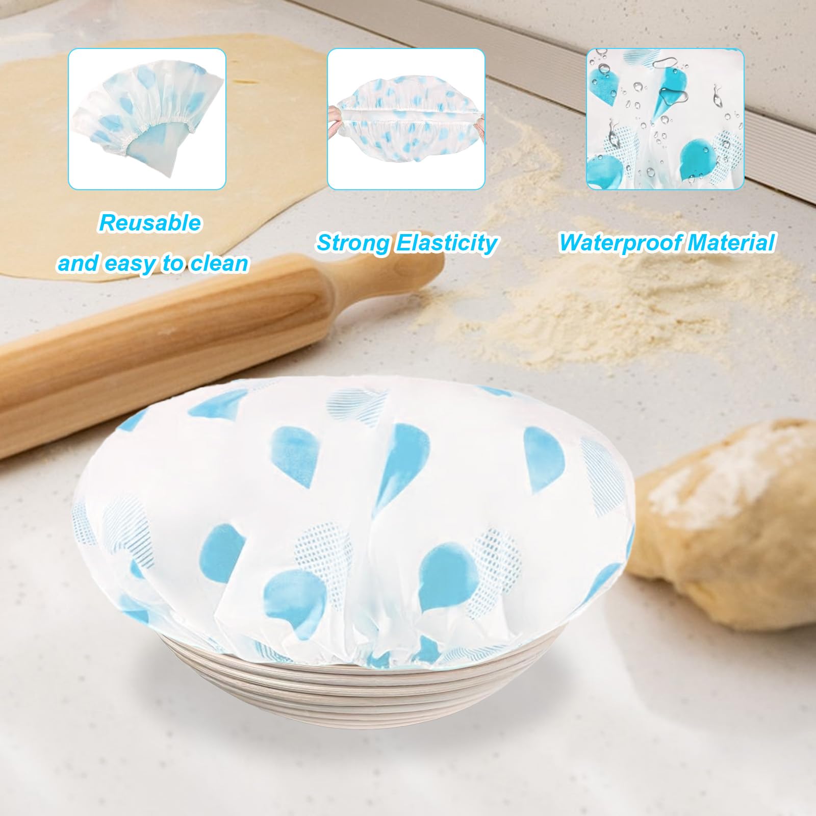 Nie wieder austrocknender Teig! Diese 6 elastischen Abdeckhauben (je 27cm Durchmesser) sind perfekt für die Brotgärung. Aus lebensmittelechtem EVA-Material - ungiftig, reißfest und wasserdicht. Der Gummizug dehnt sich, passt an jeden Gärkorb, jede Schüssel. So bleibt der Teig feucht, sauber und gärt gleichmäßig. Nach Gebrauch einfach mit warmem Wasser abwaschen (nicht spülmaschinenfest). Es gibt 3 Farben: Blau, Grau, Mandel - je 2 Stück. Aber die Hauben können mehr: Abdecken von Obst, Salaten, Resten im Kühlschrank - alles bleibt frisch! Super für zu Hause, Bäckereien, Picknicks oder Partys. Umweltfreundlich, weil wiederverwendbar. Mach dein Brotbacken einfacher und hygienischer - mit diesen praktischen Abdeckhauben. Einfach überstülpen und der Teig ist bestens geschützt!