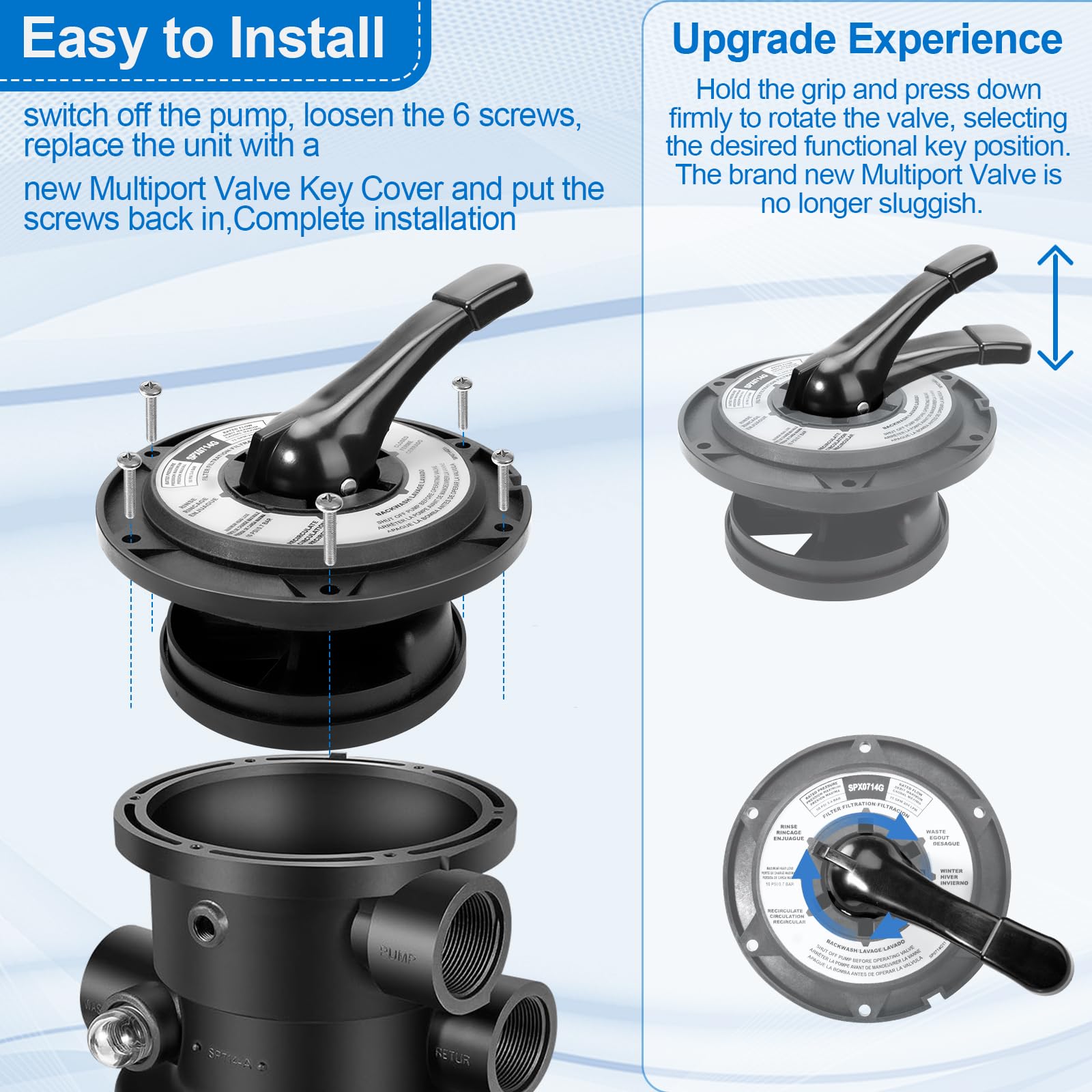 Dein Poolventil macht Probleme? Diese Griffmontage-Abdeckung ist die perfekte Lösung! Kompatibel mit vielen Hayward Multiport-Ventilmodellen wie SP0710, SP0711, SPX0740BA und SP0712. Passt auch super zu den S200 und Pro Series Sandfilterventilen. Aus robustem Kunststoff gefertigt, hält sie auch bei häufigem Gebrauch problemlos stand. Die Installation ist super einfach - keine speziellen Werkzeuge oder Profi-Hilfe nötig. Einfach die alte Abdeckung abnehmen und diese hier montieren. So hast du wieder einen stabilen Griff für dein Ventil und optimierst die Wasserzirkulation in deinem Pool. Das Teil erfüllt internationale Standards und ist daher weltweit einsetzbar. Perfekt für Poolbesitzer, die ihr Filtersystem selbst warten wollen. Spart Zeit und Geld für teure Reparaturen. Einfach bestellen, einbauen und den vollen Poolgenuss wieder genießen!