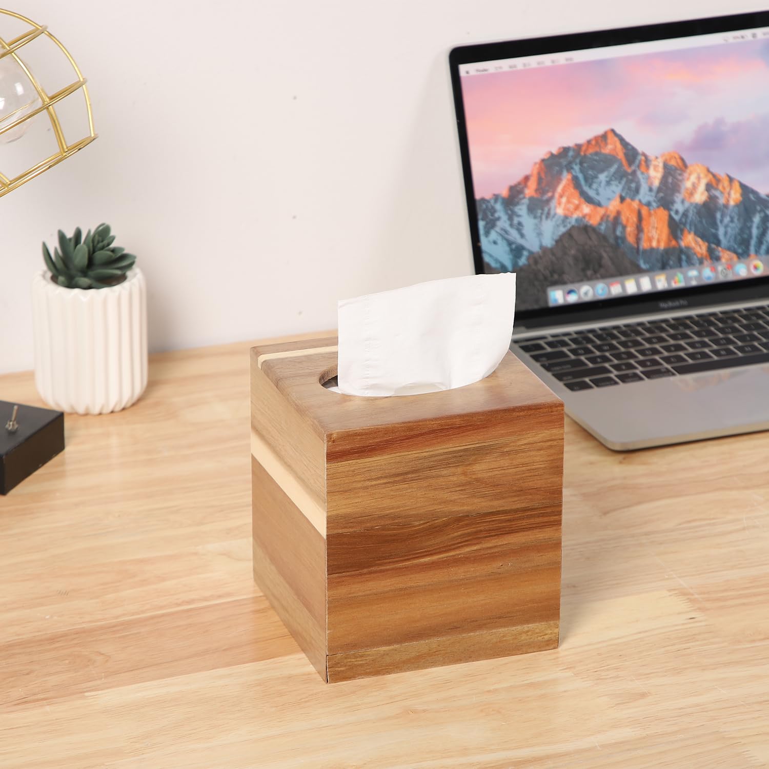 Versteck deine Taschentuchbox in style! Diese elegante Abdeckung aus massivem Akazienholz verwandelt langweilige Pappboxen in einen echten Hingucker. Mit ihrem rustikalen Bauernhaus-Design passt sie perfekt ins Wohnzimmer, Badezimmer oder auf den Esstisch. Die verschiebbare Bodenplatte mit Magnetverschluss macht das Nachfüllen super einfach - die Platte bleibt sicher an Ort und Stelle. Hochwertig verarbeitet mit sorgfältig polierten Kanten und glatter Oberfläche. Passt perfekt für Standard-Taschentuchboxen (11,5x11,5x12,7 cm). Einfach zu reinigen - nur mit einem feuchten Tuch abwischen. Perfekt als Geschenk für Einweihungen, Hochzeiten oder Geburtstage. Bring natürlichen Charme in dein Zuhause und versteck die Taschentücher in diesem schicken Holz-Würfel!