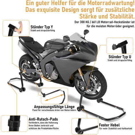 Dieser robuste Motorradständer von Abhpjuy macht Transport und Lagerung deines Motorrads zum Kinderspiel! Die verstellbare Wippe aus stabilem Stahl hält dein Bike sicher in Position.\n\nTechnische Daten:\n- Material: Stahl mit Sprühbeschichtung\n- Maximale Traglast: 816 kg\n- Verstellbare Höhe\n- 4 Montagelöcher\n\nDas Dreiloch-Mehrstufensystem ermöglicht eine flexible Anpassung an verschiedene Reifenhöhen. So passt der Ständer für die meisten Motorrad-Modelle, egal ob Offroad, Standard oder Schwerlast.\n\nKompatibilität:\n- Reifendurchmesser: 381-533,4 mm\n- Reifenbreite: 76,2-203,2 mm\n- Für die meisten Motorradtypen\n\nEinfache Installation:\n- Mit 4 Montagelöchern\n- Für Garage, Werkstatt oder Anhänger\n- Abnehmbare Teile für platzsparende Lagerung\n- Kein Spezialwerkzeug nötig\n\nDie Stahlkonstruktion ist rost- und korrosionsgeschützt. Sie verformt sich nicht, auch nicht bei schweren Motorrädern. Dein Bike wird sicher gehalten, ohne dass der Lack Schaden nimmt.\n\nPerfekt für:\n- Werkstatt und Garage\n- Transport im Anhänger\n- Langzeit-Lagerung\n- Wartungsarbeiten\n- Präsentation auf Events\n\nOb für die tägliche Nutzung in der Werkstatt oder für den gelegentlichen Transport - dieser Ständer ist ein zuverlässiger Helfer. Dein Motorrad steht sicher und stabil, egal wo du es abstellst.