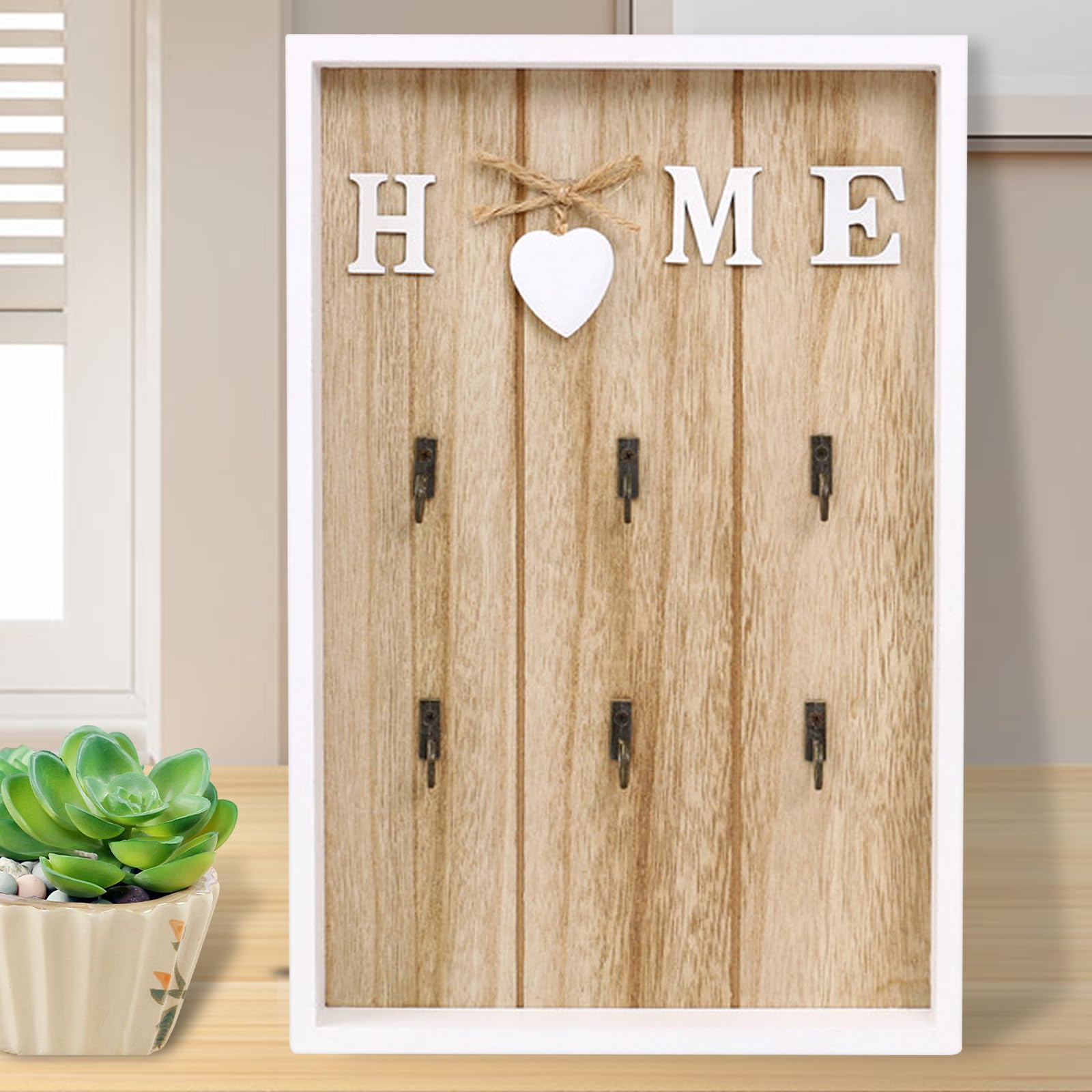 Endlich Ordnung im Flur! Dieses schicke Schlüsselbrett aus Holz hat 6 stabile Haken für alle deine Schlüssel. Maße: 30,2x12x6,2cm - nicht zu groß, nicht zu klein.