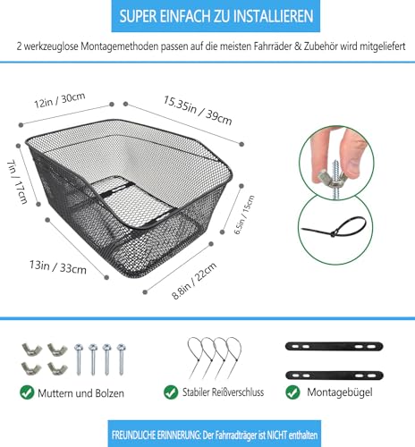 Endlich mehr Platz für all deine Sachen beim Radfahren! Dieser praktische Fahrradkorb für hinten ist der perfekte Begleiter für alle, die ihr Fahrrad wirklich nutzen wollen. 🚲\n\nMit 39x30x26cm (LxBxH) bietet der Korb reichlich Stauraum für Einkäufe, Schultaschen, sogar für kleinere Hunde! Bis zu 25kg trägt er problemlos - da kannst du getrost deinen Wochenendeinkauf transportieren.\n\nAus robustem Metalldraht gefertigt und mit Anti-Rost-Beschichtung versehen, hält der Korb auch bei Regen problemlos stand. Die Montage ist super einfach: Schrauben raus, Korb anbringen, Schrauben rein - fertig!\n\nOb für den Arbeitsweg, die Einkaufstour oder den Ausflug mit dem Hund - dieser Korb macht dein Fahrrad zum praktischen Transportmittel. Nie wieder mit vollen Taschen unsicher radeln!\n\nDie Reinigung ist ein Kinderspiel: Einfach mit feuchtem Tuch abwischen oder mit Wasser abspülen. So bleibt der Korb lange schön und funktional.