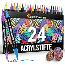 Alter, diese Acrylstifte von BETEM sind der absolute Burner für alle Kreativen! Mit 36 verschiedenen Farben hast du eine Riesenauswahl für deine Projekte. Das geniale Feature: Jeder Stift hat eine Doppelspitze - eine 1-5mm Pinselspitze für große Flächen und eine 1mm Feinspitze für Details.\\n\\nIm Gegensatz zu vielen anderen Acrylstiften musst du hier nicht erst die Spitze drücken - sie sind sofort einsatzbereit! Die Tinte ist wasserfest, lichtbeständig und trocknet super schnell. Perfekt also für Steine, Holz, Leinwand, Glas - du name it!\\n\\nEgal ob du deine Steinsammlung verschönern, Tassen bemalen oder einfach nur in deinem Skizzenbuch rumkritzeln willst - mit diesen Stiften macht's richtig Spaß. Die Farben sind kräftig und decken super.\\n\\nWichtig: Immer schön die Kappe draufmachen nach Gebrauch, sonst trocknen die Spitzen ein. Und am besten die Stifte flach lagern. Aber ansonsten sind sie absolut unkompliziert. Super als Geschenk für Künstler, Kinder oder einfach für dich selbst. Deiner Kreativität sind keine Grenzen gesetzt - leg los!