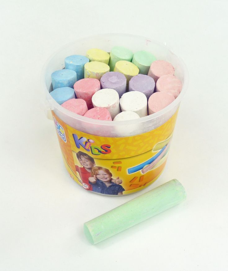 Im praktischen Eimer mit den Maßen 18,7x18,7x11,6 cm sind 6 verschiedene Farben enthalten: rot, blau, gelb, grün, lila und weiß. Die Kreiden sind kräftig und hinterlassen satte Farben auf Asphalt oder Stein.