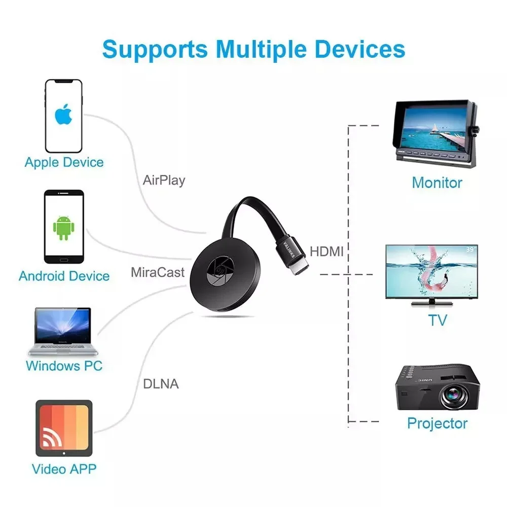 Endlich kabellos streamen! Dieser clevere HDMI Dongle verwandelt deinen Fernseher oder Beamer in einen Smart Screen. Einfach einstecken und sofort drahtlos Fotos, Videos oder Präsentationen von deinem Smartphone, Tablet oder Laptop spiegeln - in knackigem 4K! Unterstützt Airplay für Apple Geräte, Miracast für Android und DLNA für Multimedia-Inhalte. Keine lästigen Apps oder Treiber nötig - einfach Plug & Play! Perfekt für Filmabende, Business-Präsentationen oder Familienfotos auf dem Großbildschirm. Kompakt, leise und super einfach zu bedienen!