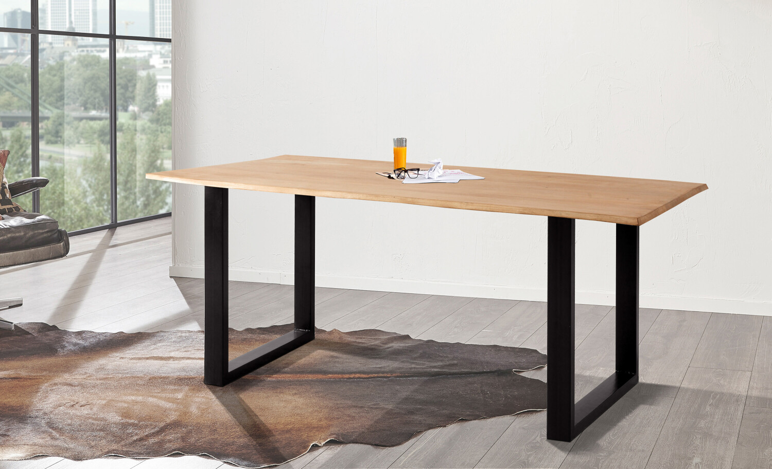 Akazienholz ist richtig robust - härter als Eiche und extrem langlebig. Die 26 mm dicke Platte ist mit Klarlack versiegelt, sodass sie pflegeleicht ist. Ein feuchtes Tuch reicht meist zur Reinigung. Das mattschwarze Metallgestell in U-Form gibt dem Tisch modernen Halt.