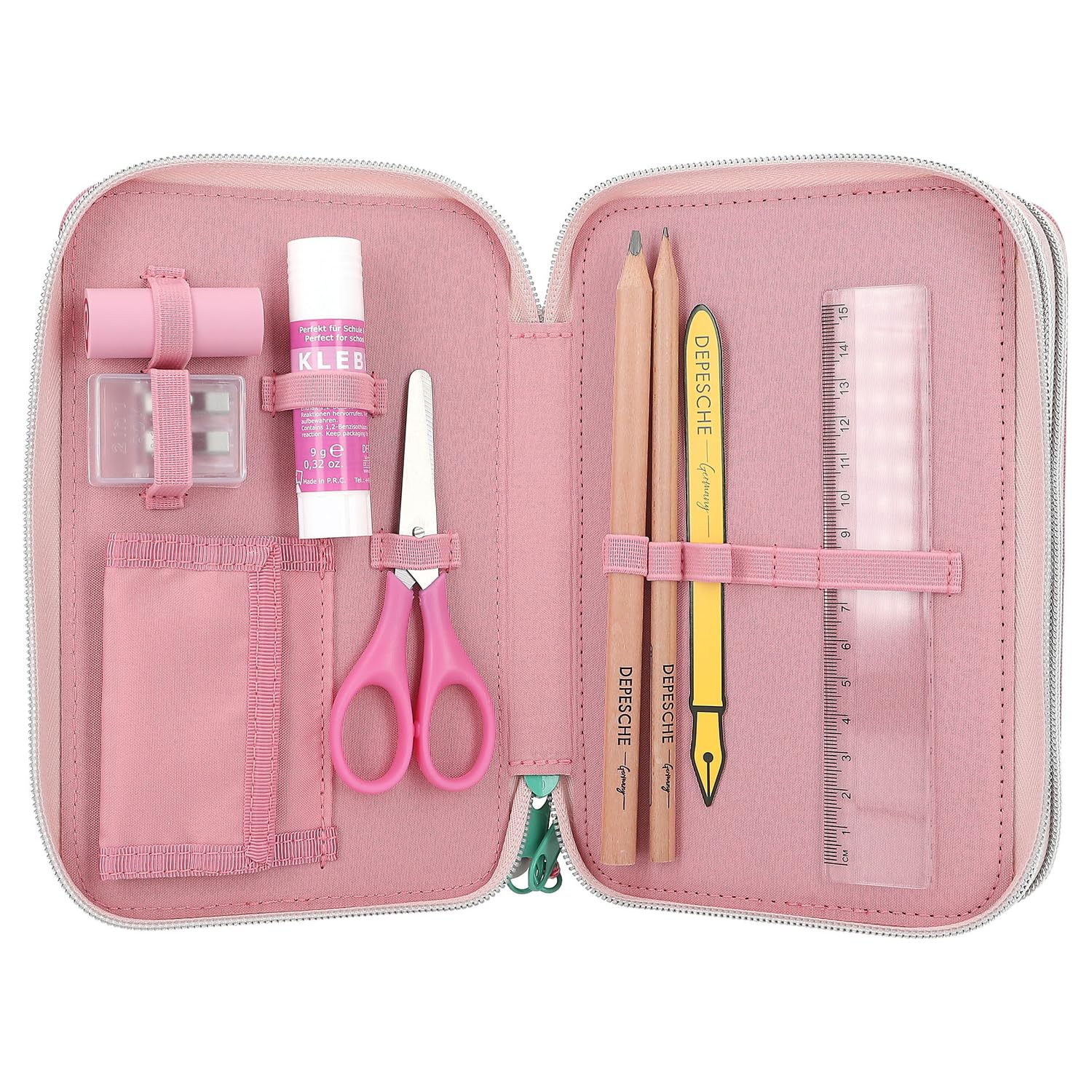 Abenteuer garantiert! Die Depesche Federtasche im coolen Adventure World Panther-Design ist nicht nur hübsch anzusehen, sondern auch komplett gefüllt mit allem, was Schulkinder brauchen. Enthalten sind 18 Buntstifte, 18 Filzstifte, 2 Bleistifte, Anspitzer, Radiergummi, Lineal, Schere, Klebestift und ein praktisches Klett-Täschchen für Kleinteile. Das absolute Highlight: Die LED-Lichter auf der Vorderseite! Ein Knopfdruck und schon leuchten die Augen und das Maul des Panthers für etwa 15 Sekunden - total beeindruckend! Mit den Maßen von 20x13x7,5 cm passt die Federmappe in jeden Schulranzen. Achtung: Nicht für Kinder unter 3 Jahren geeignet wegen verschluckbarer Kleinteile. Die Batterien sind natürlich nicht im Lieferumfang enthalten. Diese Federtasche macht nicht nur in der Schule eine gute Figur, sondern auch im Kindergarten oder in der Freizeit. Ein cooles Geschenk, das garantiert für Begeisterung sorgt!