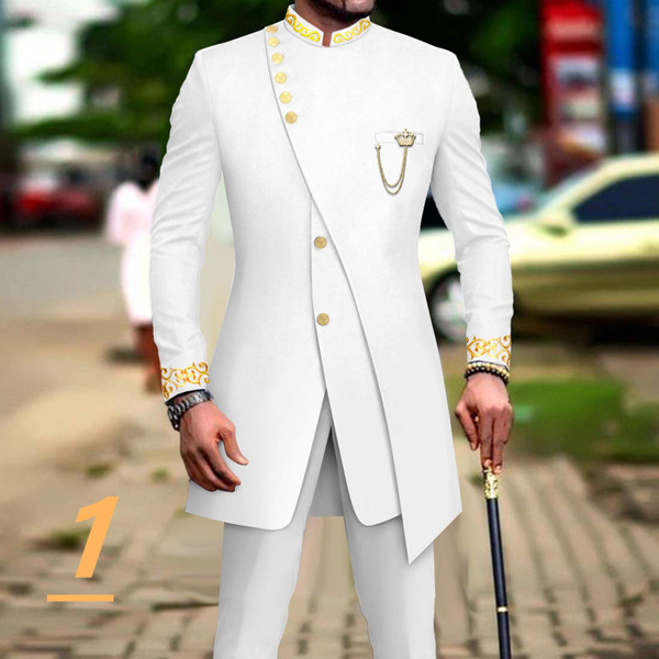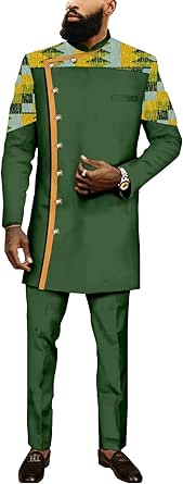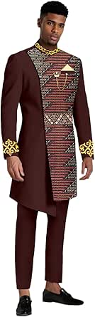 Entdecke die bunte Welt afrikanischer Mode! Dieser stylische 2-teilige Anzug besteht aus einem eleganten Blazer mit hohem Kragen und einer passenden Hose mit elastischem Bund. Die aufwendigen Stickereien verleihen dem Outfit einen authentischen afrikanischen Charakter. \\n\\nDas Material ist weich, atmungsaktiv und angenehm auf der Haut - perfekt auch für wärmere Tage. Der slim Fit Schnitt sorgt für eine moderne, figurbetonte Silhouette. \\n\\nGrößentabelle zur Orientierung:\\n• S ≈ US 39-40R (Brust ~98-102cm)\\n• M ≈ US 41-42R (Brust ~104-107cm)\\n• L ≈ US 43-44R (Brust ~109-112cm)\\n• XL ≈ US 47-48R (Brust ~119-122cm)\\n• XXL ≈ US 51-52R (Brust ~129-132cm)\\n\\nDesign Features:\\n• Hoher Kragen mit Stickerei\\n• Volle Ärmel\\n• Inklusive dekorativer Kette und Halstuch\\n• Hose mit elastischem Bund und Kordelzug\\n• 2 seitliche schräge Taschen\\n\\nPerfekt für:\\n• Afrikanische Feste und Hochzeiten\\n• Kulturveranstaltungen\\n• Besondere Anlässe\\n• Fotoshootings\\n\\nPflege: Maschinenwäsche bei 30°C, auf links waschen, nicht bleichen. \\n\\nWichtig: Bei Bestellung innerhalb von 30 Minuten deine Körpermaße (Größe, Brust, Taille, Hüfte) mitteilen für perfekte Passform!